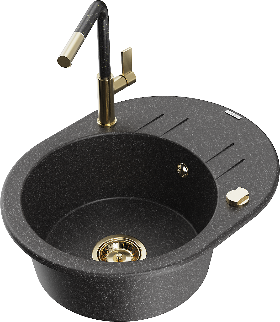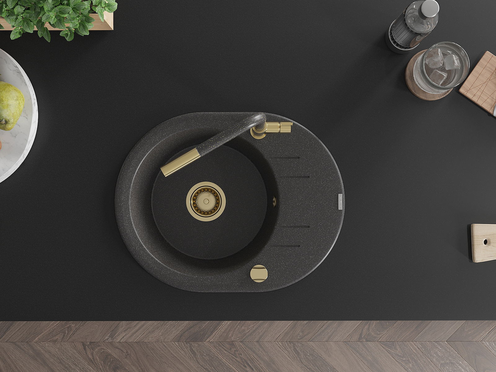 Mexen Kevin lavello in granito a 1 vasca con scolapiatti e miscelatore da cucina Flora, nero maculato - 6517-76-670401-75-G