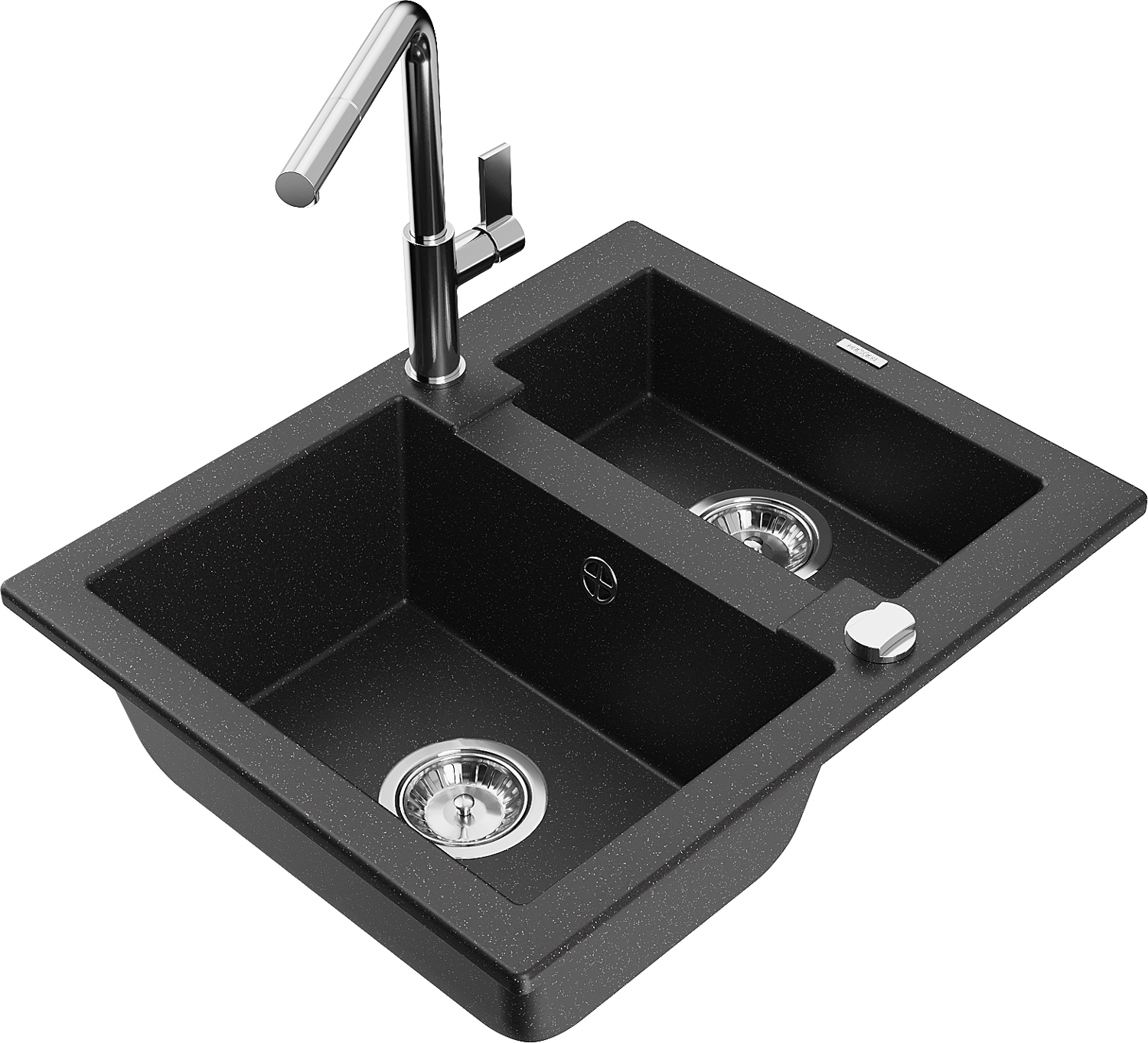 Mexen Carlos lavello in granito 1,5 vasche con rubinetto da cucina Flora, nero/argento metallico - 6518-73-670401-00
