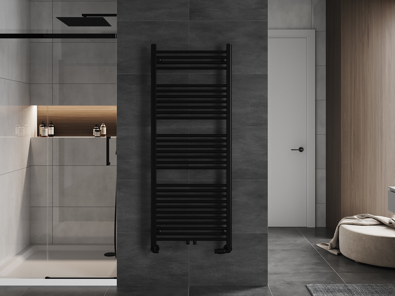 **Radiatore da bagno Mexen Mars** è la soluzione ideale per il tuo bagno, combinando un aspetto moderno con efficienza. Con dimensioni di 1500 x 600 mm e una potenza termica di 729 W, assicura un calore confortevole. L'acciaio nero RAL 9005 aggiunge eleganza, e il rivestimento durevole garantisce resistenza alla corrosione. Grazie a diverse opzioni di collegamento, incluso centrale 2xG ½″, è estremamente versatile. Può funzionare a una temperatura fino a 95 °C e una pressione di 0,6 Mpa. Pesa 11,10 kg, facilitando l'installazione, e il set include tutti gli accessori necessari.