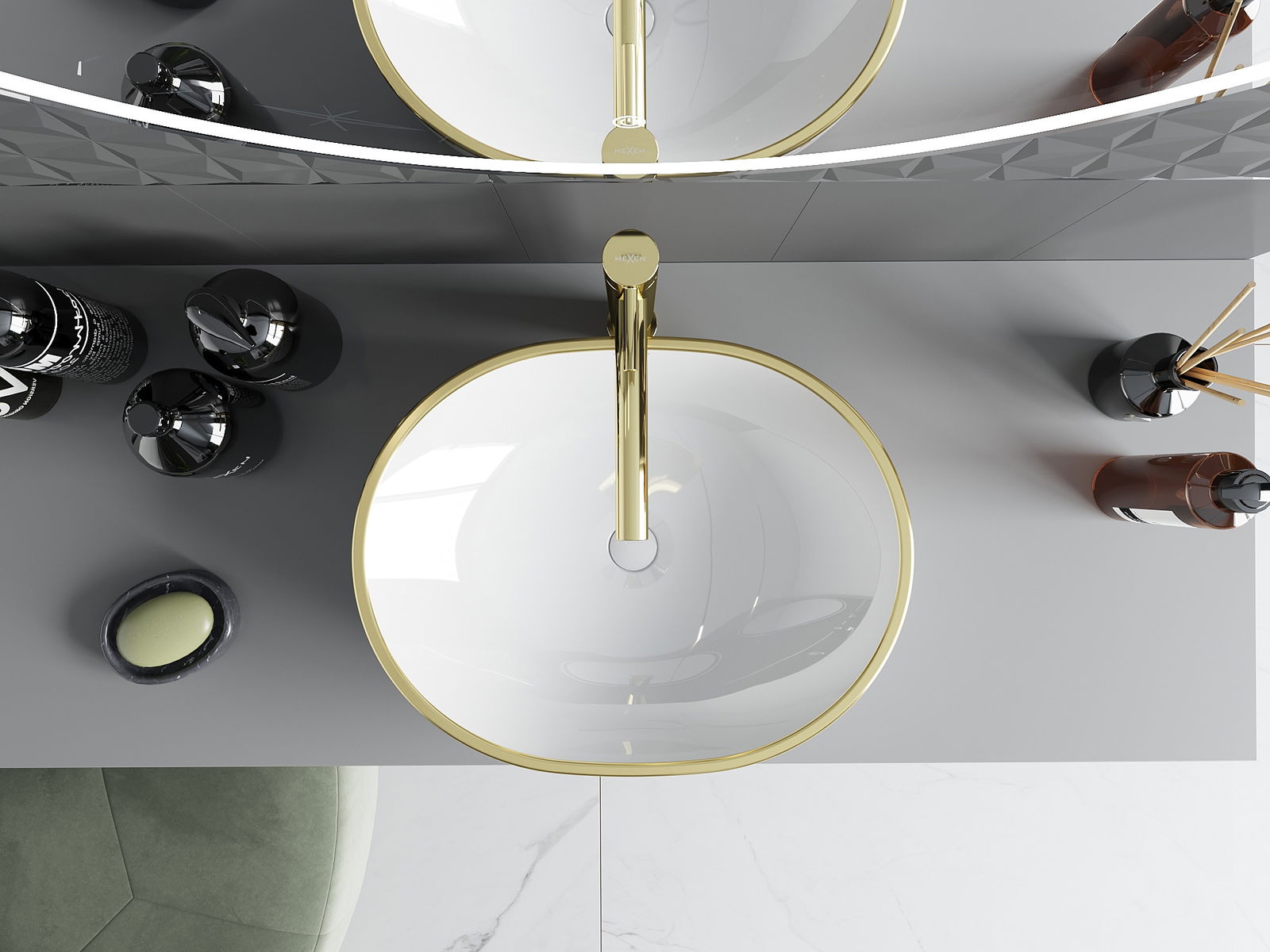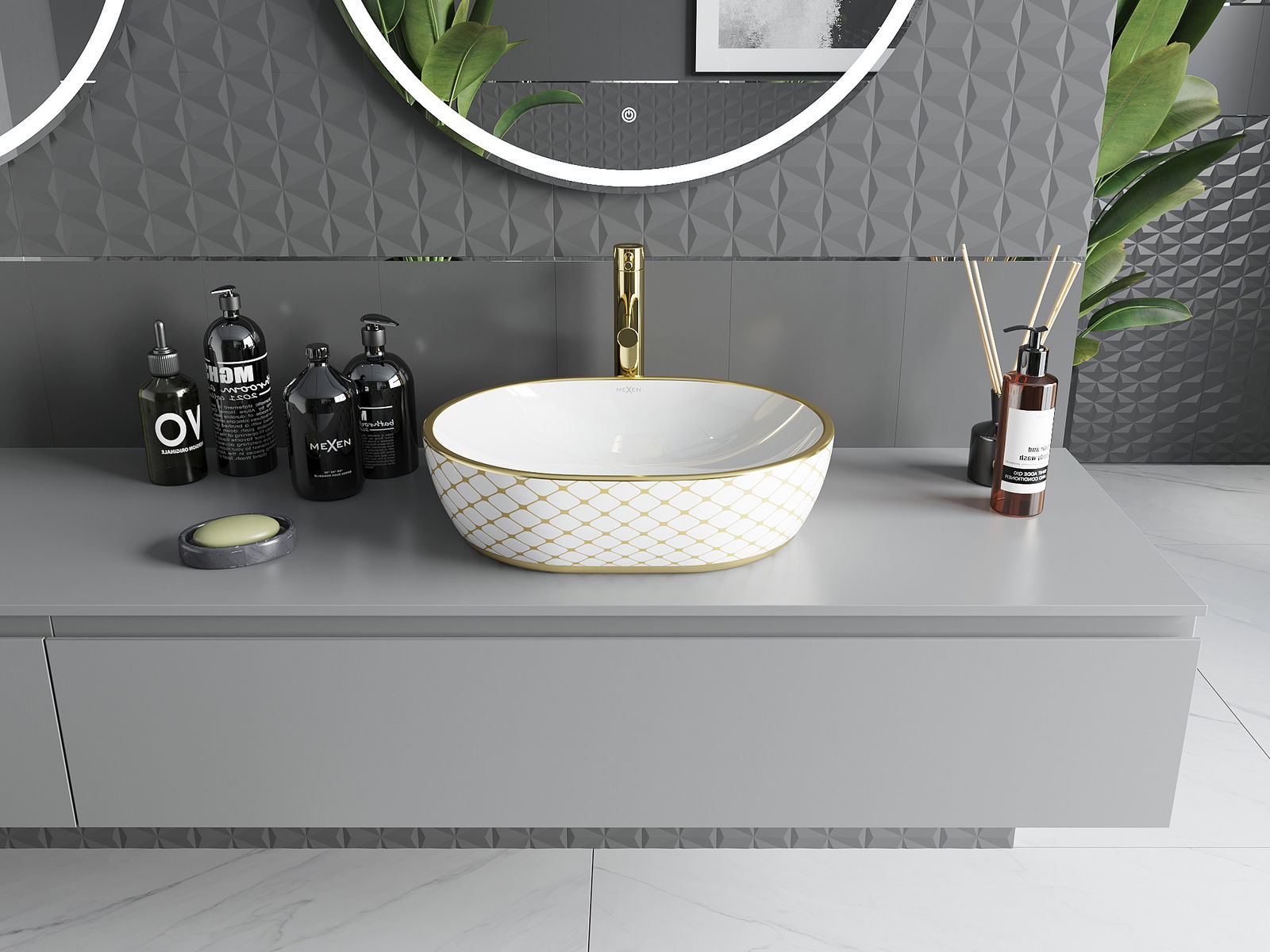 Il lavabo da appoggio Mexen Viki 48 x 35 cm è l'ideale combinazione di stile e funzionalità. Realizzato in ceramica sanitaria, ha un elegante colore bianco con un motivo a griglia dorato, che garantisce un aspetto estetico a ogni bagno. Grazie al rivestimento protettivo, la superficie rimane in ottime condizioni a lungo. La sua forma ovale e l'altezza di 14 cm lo rendono non solo bello, ma anche pratico. L'eccezionale qualità della lavorazione e l'assenza di fori per rubinetto e troppo pieno aggiungono un carattere moderno.
