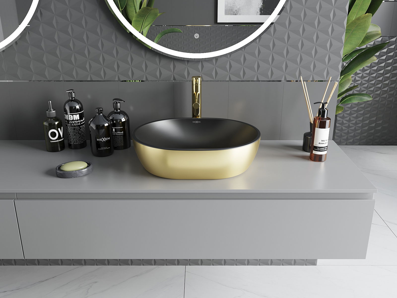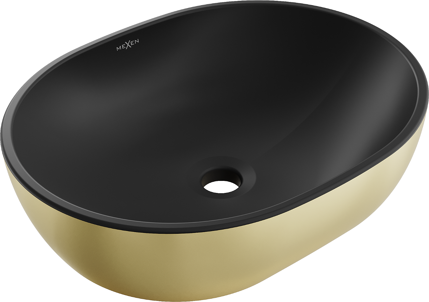 Mexen Viki è un elegante lavabo da appoggio con dimensioni di 48 x 35 cm, in un sorprendente abbinamento di nero opaco e oro. La sua originale forma ovale e la superficie lucida conferiscono al bagno un carattere moderno. Realizzato in ceramica sanitaria di alta qualità, il lavabo garantisce durabilità e facilità di pulizia. L'assenza di foro del troppopieno e per miscelatore lo rende ideale per soluzioni minimaliste. Scegli Mexen Viki per portare stile e funzionalità nel tuo spazio.