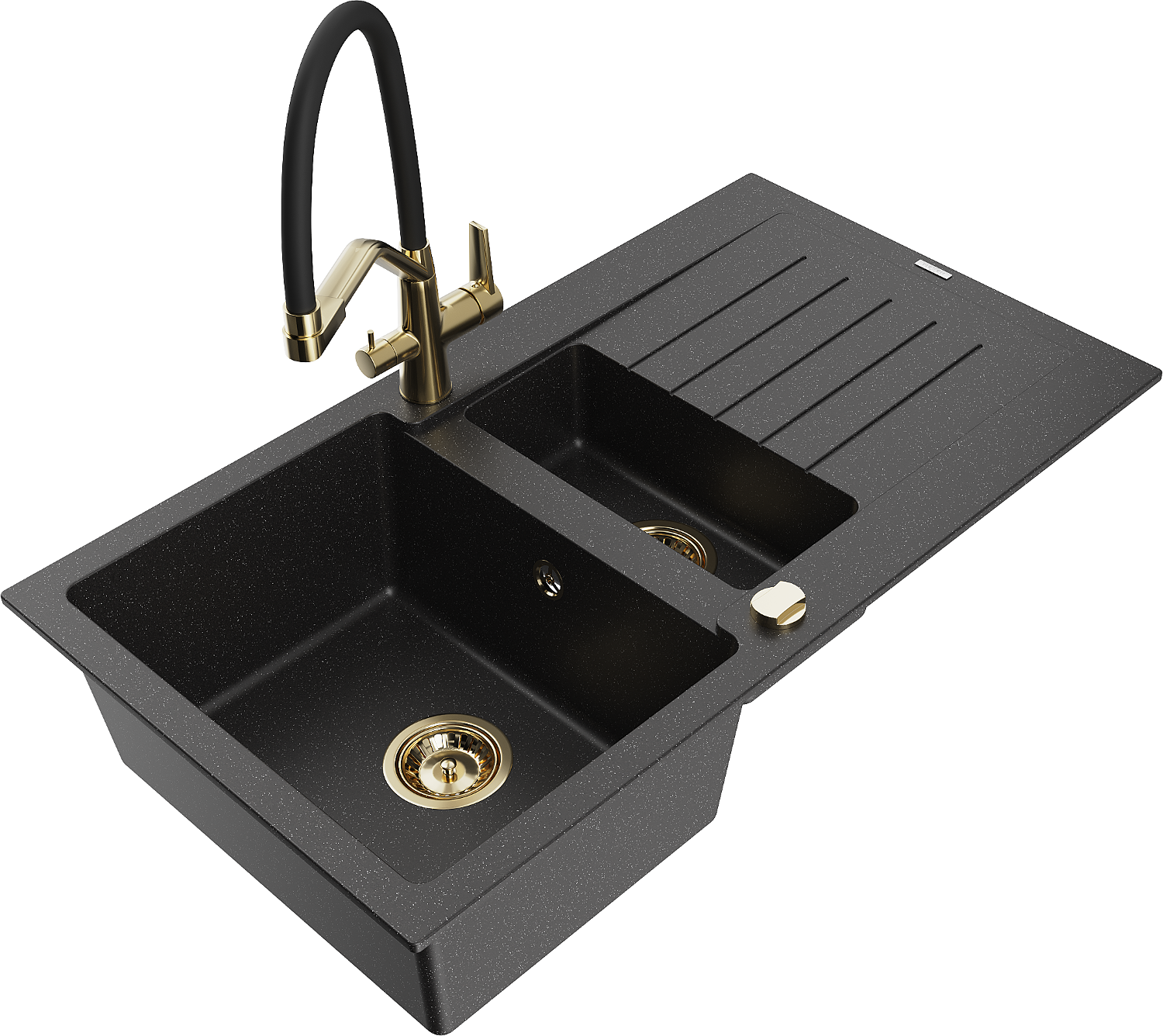 Mexen Matias lavello in granito 1,5 vasca con gocciolatoio e rubinetto da cucina Duo, nero/argento - 6502-73-671701-57-G