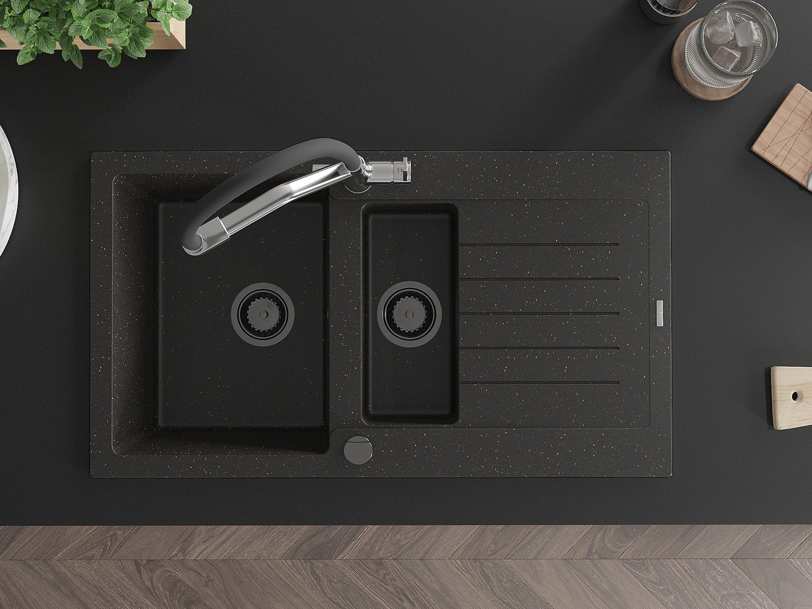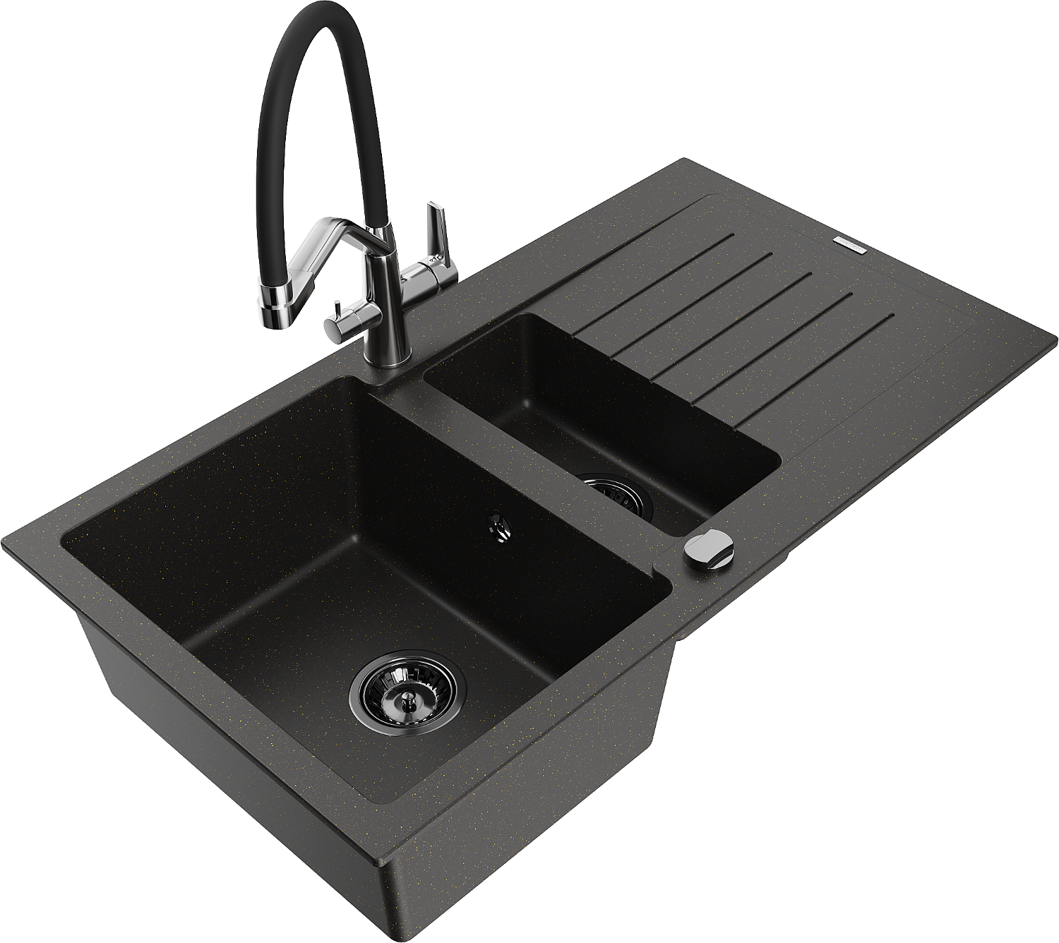Mexen Matias lavello in granito 1,5 vasca con scolapiatti e miscelatore cucina Duo, nero/oro metallizzato - 6502-75-671701-07-B