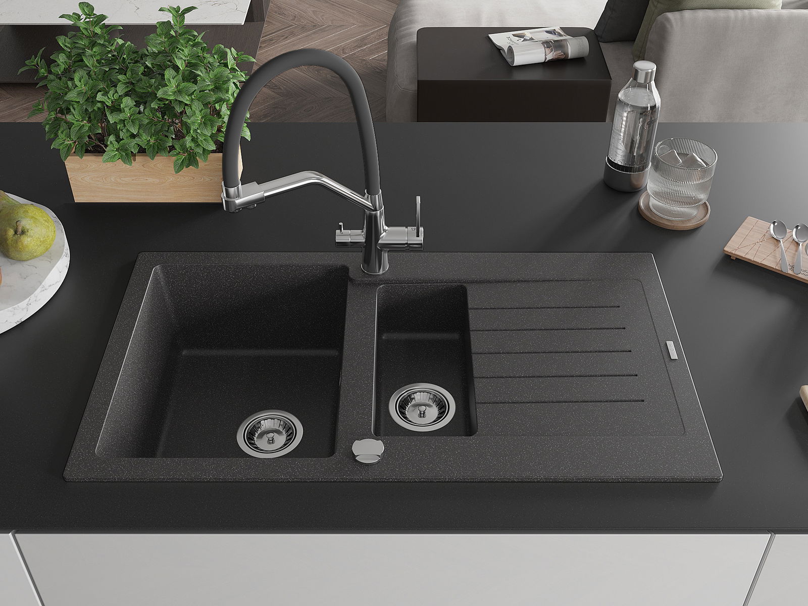 La scelta di un lavello con sgocciolatoio è una soluzione pratica che consente di riporre piatti, verdure e frutta lavati. Lo sgocciolatoio facilita la cucina quotidiana e aiuta a mantenere l'ordine in cucina.
