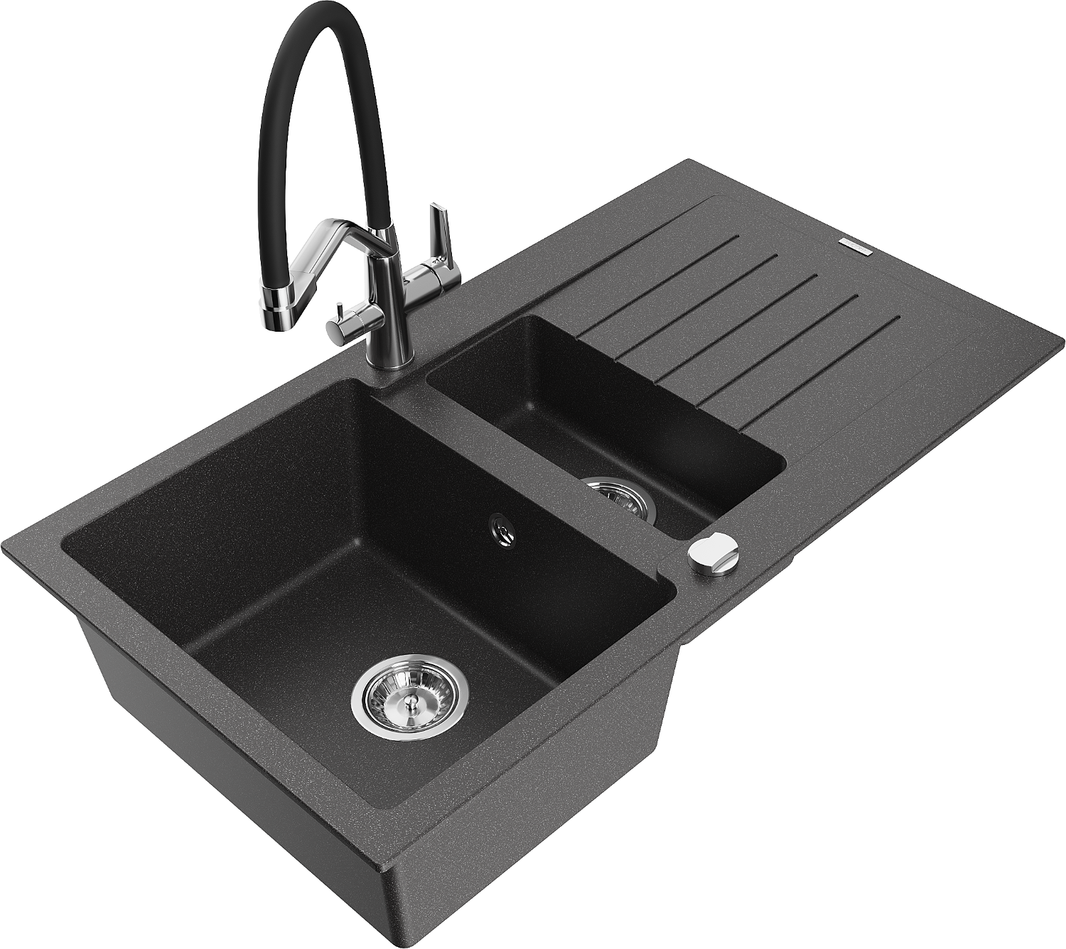 Mexen Matias lavello in granito 1,5 vasche con gocciolatoio e rubinetto cucina Duo, nero maculato - 6502-76-671701-07