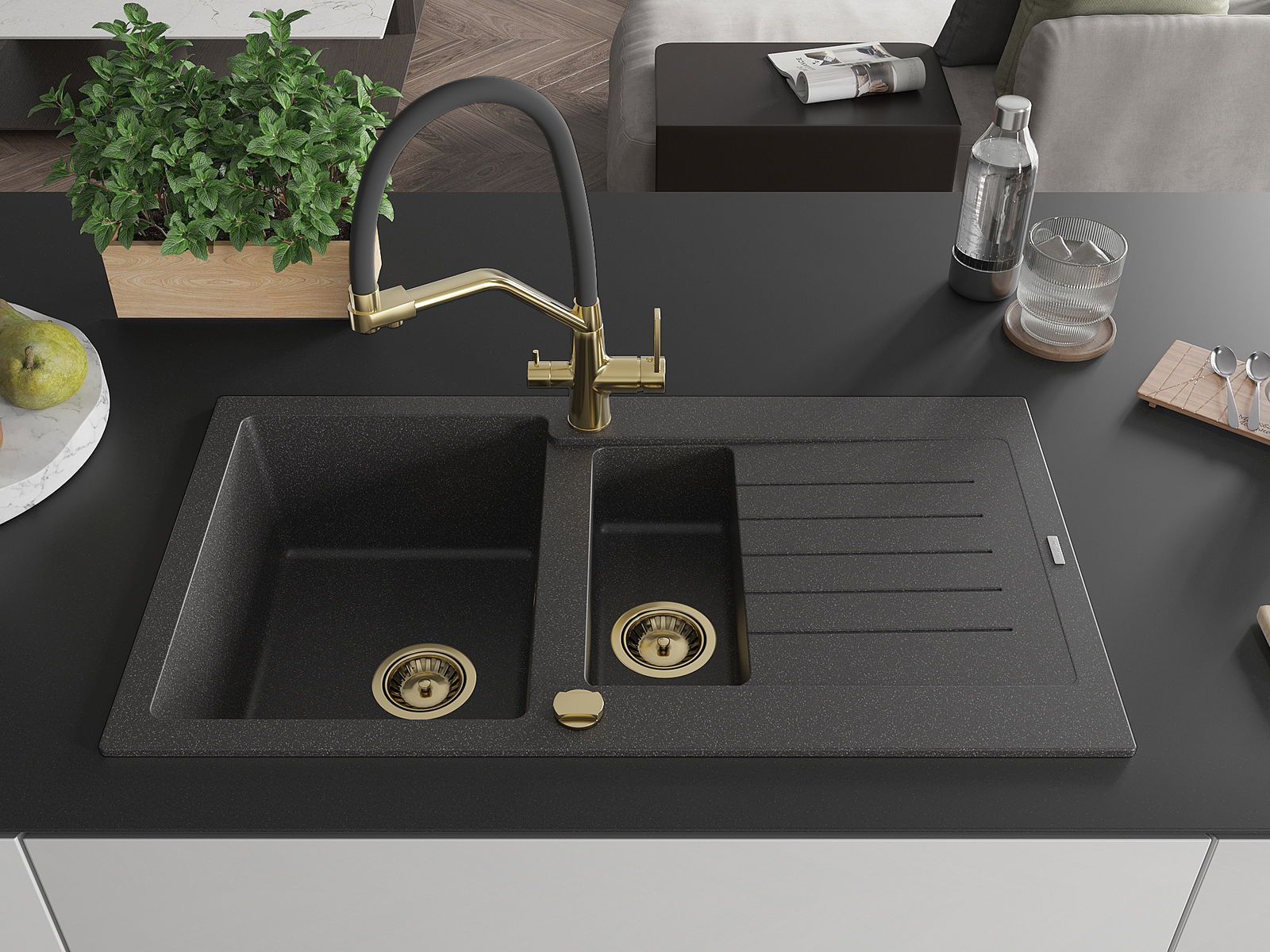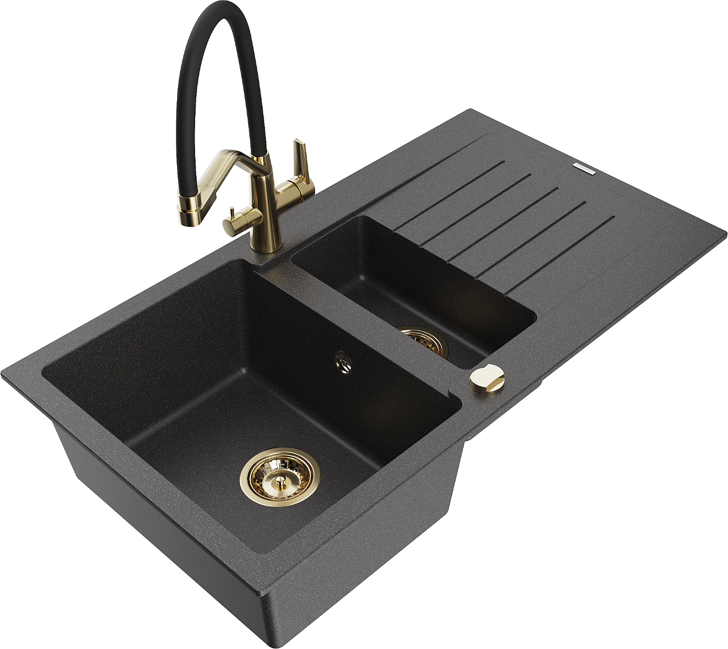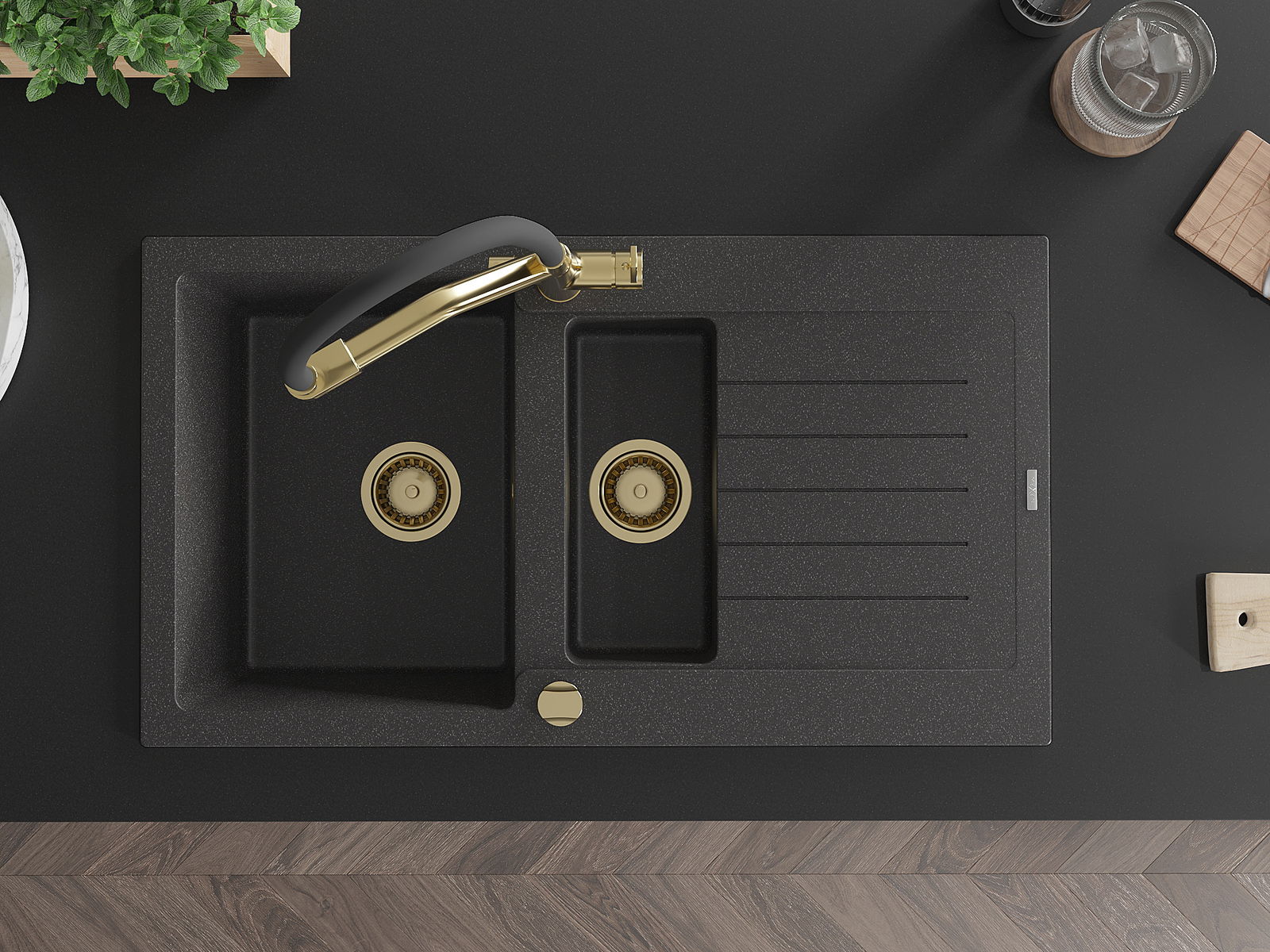 Mexen Matias lavello in granito 1,5 vasca con scolapiatti e miscelatore da cucina Duo, nero maculato - 6502-76-671701-57-G