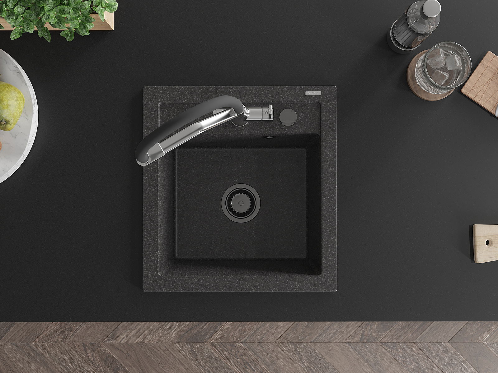 Il lavello ha un foro fresato di 35 mm di diametro da sfondare autonomamente. Può essere utilizzato, tra l'altro, per montare un dosatore di liquidi, che eliminerà la presenza di bottiglie di plastica in cucina e conferirà un tocco di eleganza.