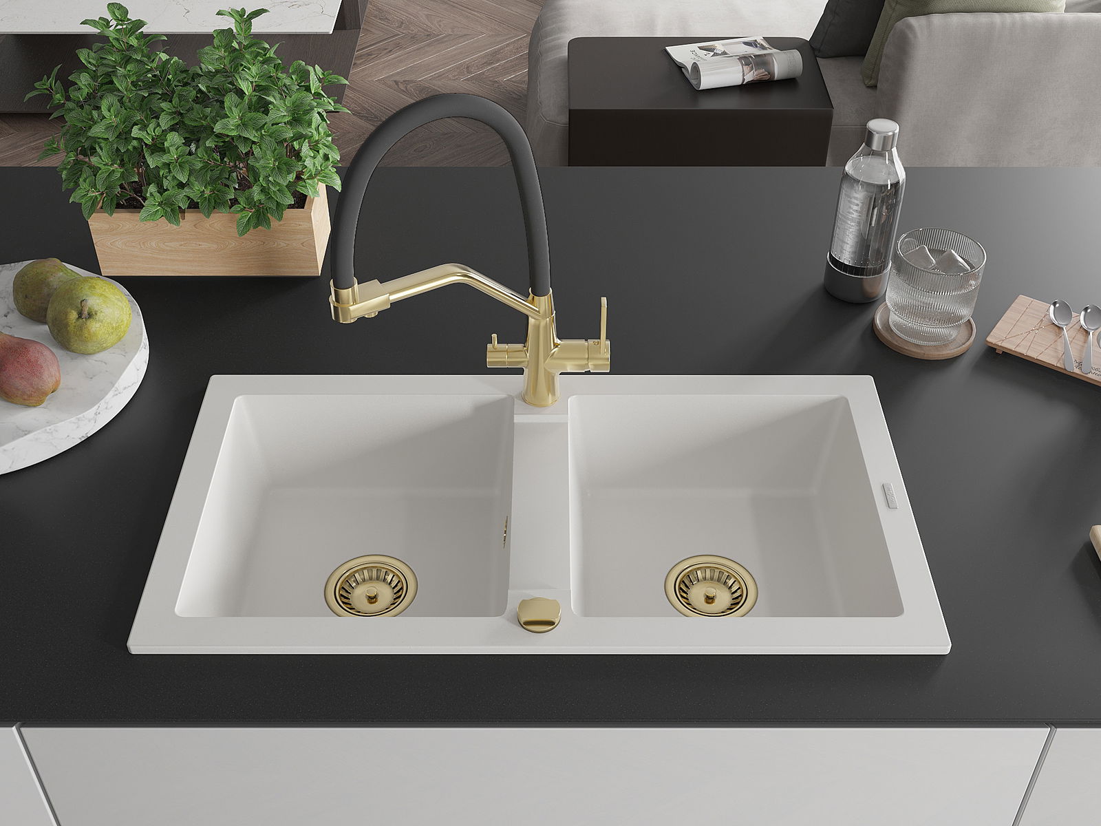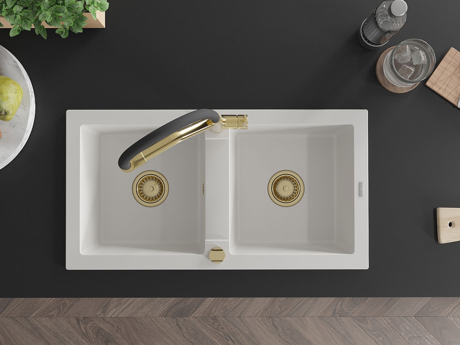 Mexen Mario lavello da cucina in granito a 2 vasche con miscelatore Duo, bianco - 6504-20-671701-57-G