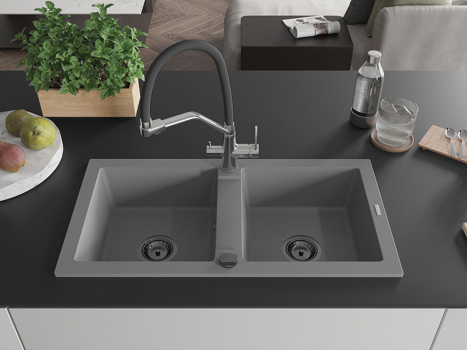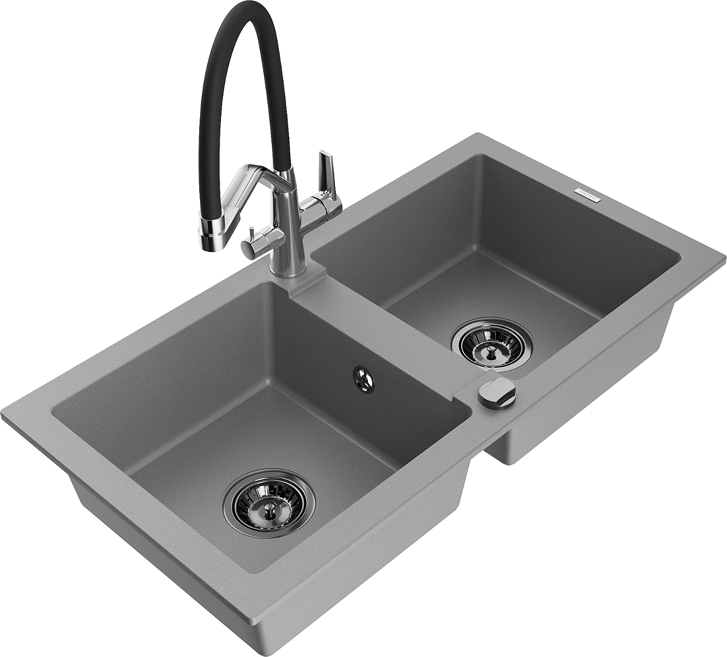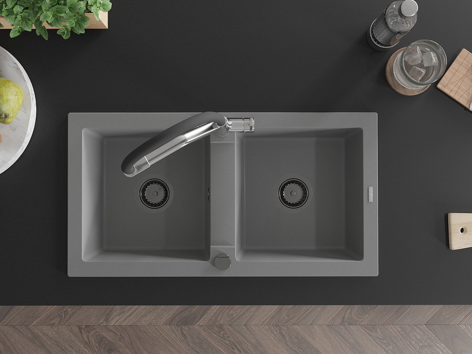 Mexen Mario lavello da cucina in granito a 2 vasche con rubinetto Duo, grigio - 6504-71-671701-07-B