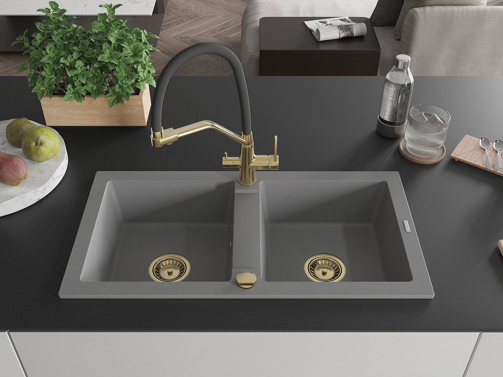 Mexen Mario lavello da cucina in granito a 2 vasche con rubinetto Duo, grigio - 6504-71-671701-57-G
