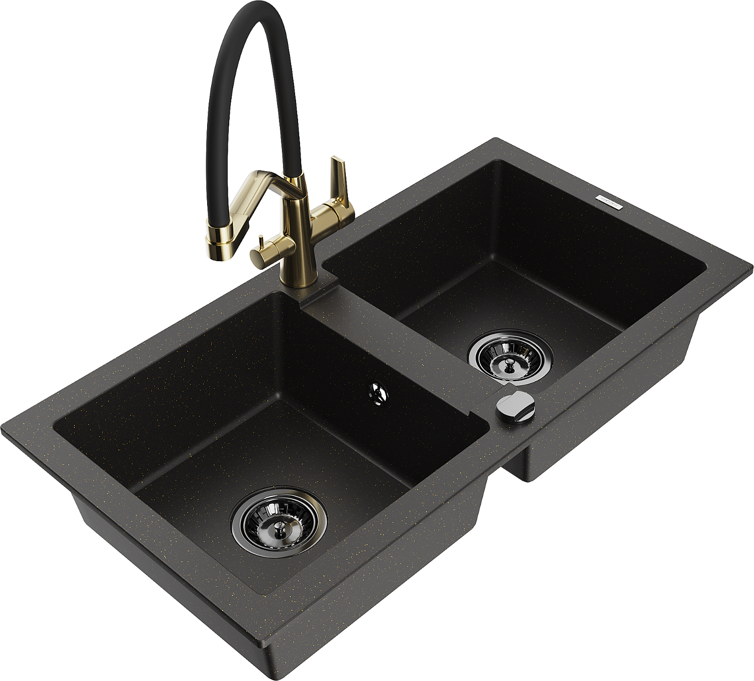 Mexen Mario lavello da cucina in granito a 2 vasche con rubinetto Duo, nero/oro metallizzato - 6504-75-671701-57-B