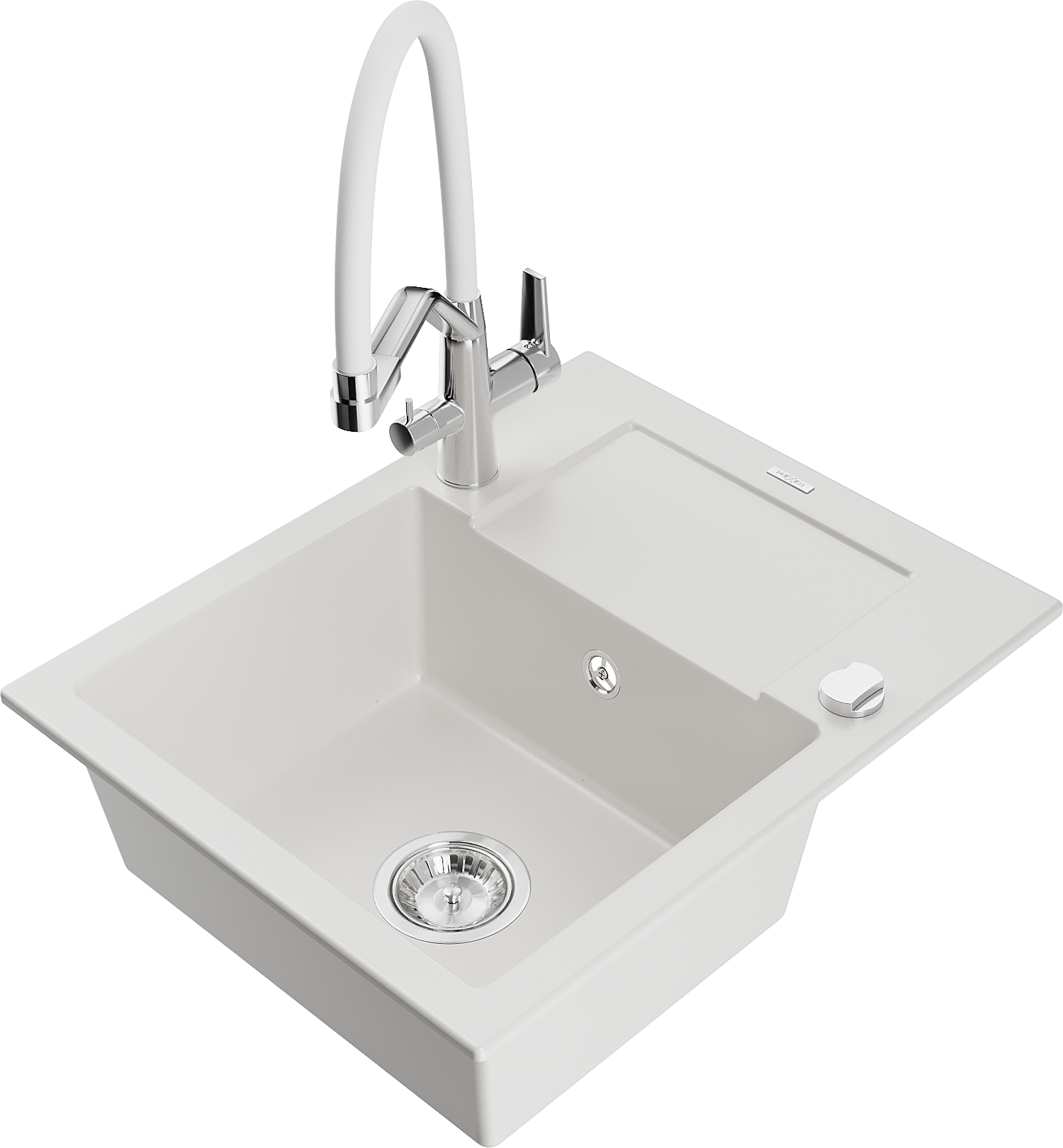 Mexen Enzo lavello da cucina in granito a 1 vasca con sgocciolatoio e rubinetto Duo, bianco - 6506-20-671701-02