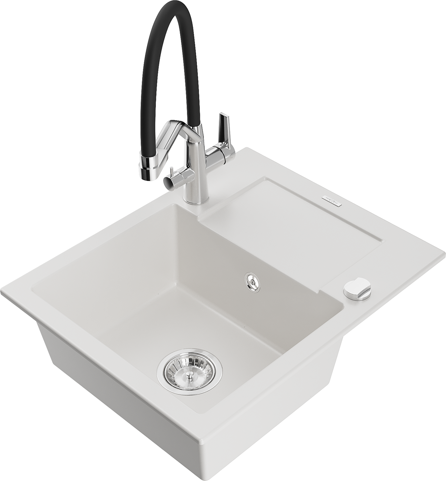 Mexen Enzo lavello in granito 1-vasca con scolapiatti e rubinetto da cucina Duo, bianco - 6506-20-671701-07
