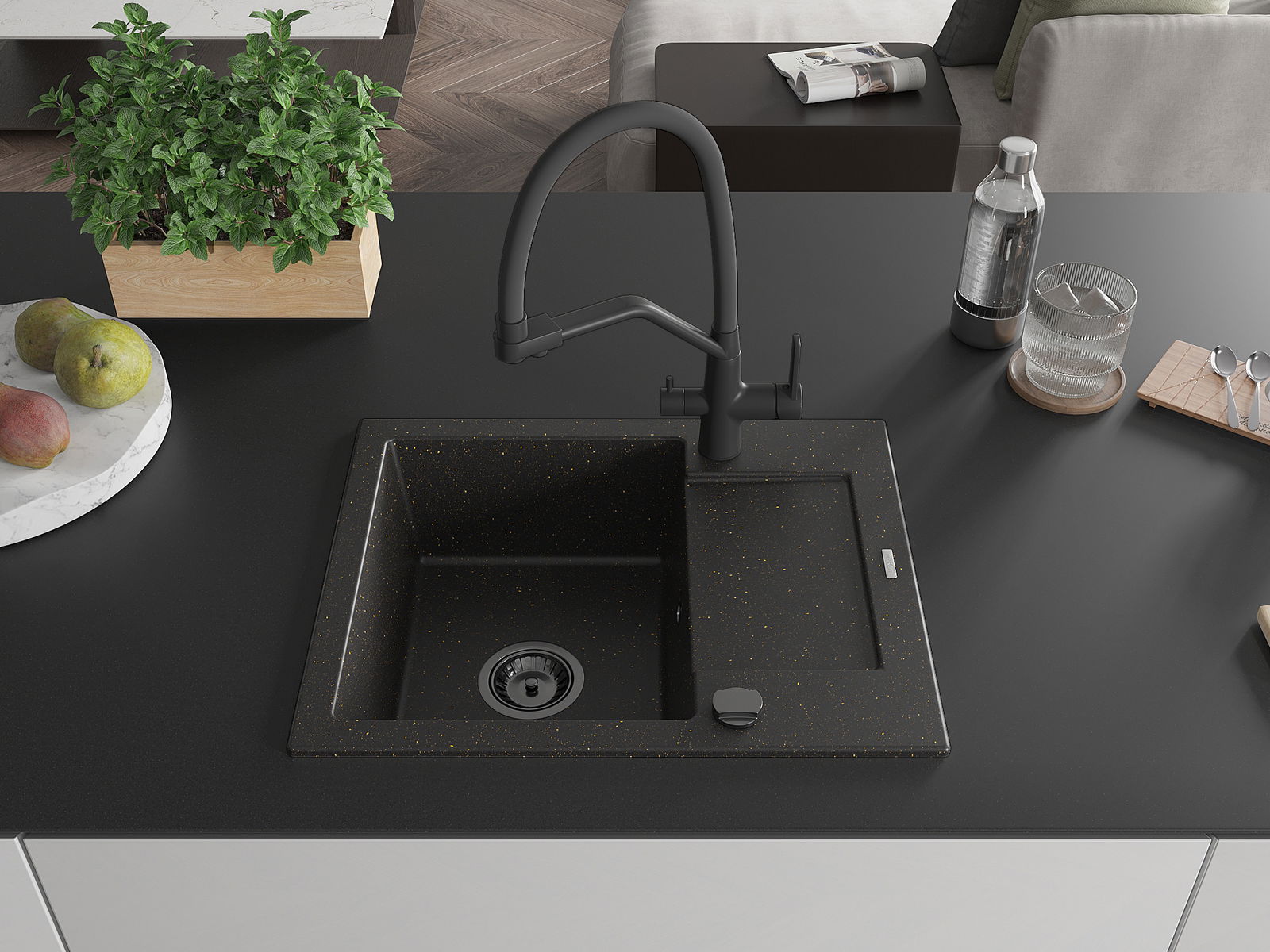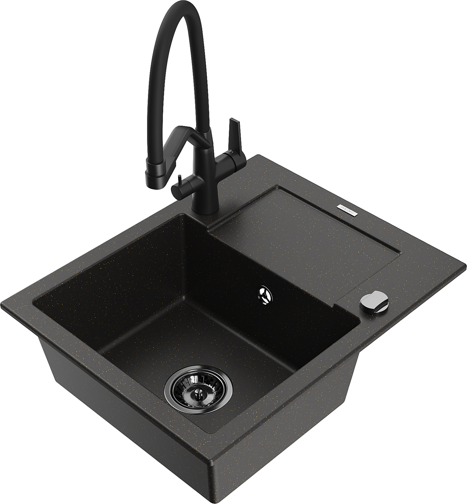 Mexen Enzo lavello da cucina in granito 1-vasca con scolapiatti e rubinetto Duo, nero/oro metallizzato - 6506-75-671701-70-B