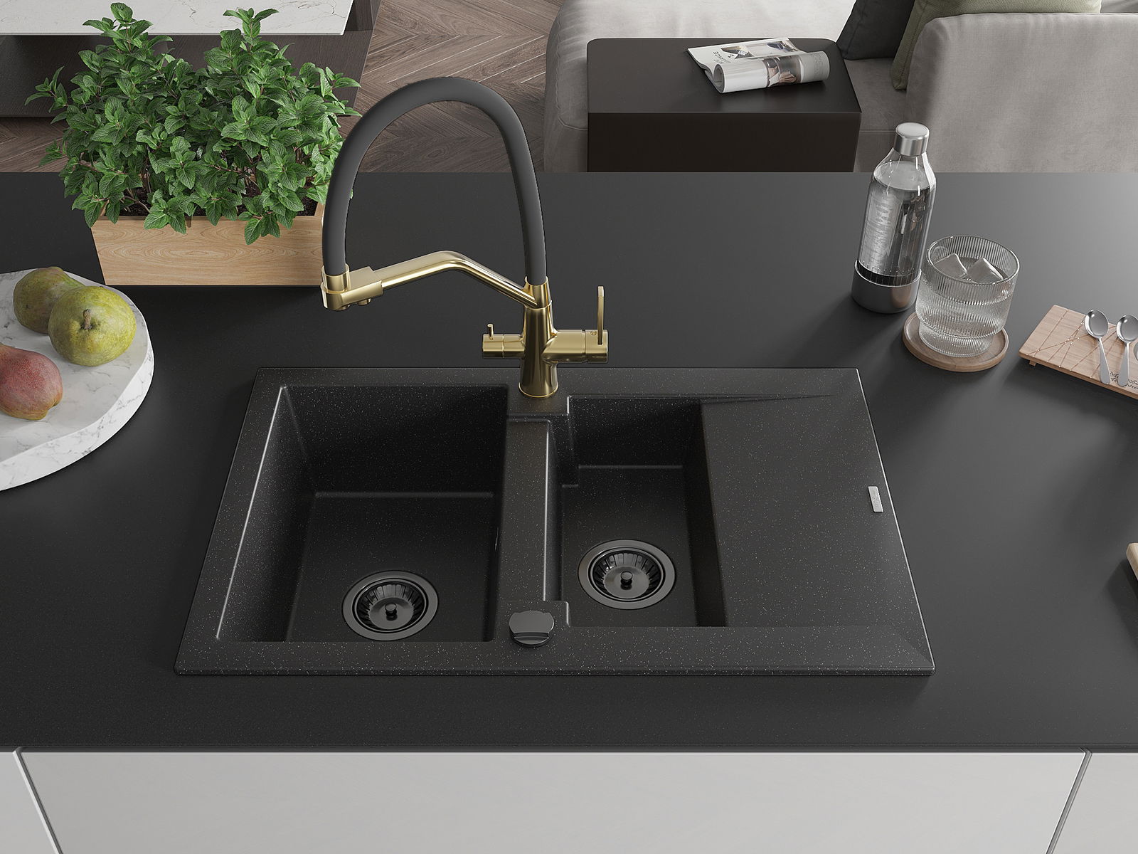 Mexen Gaspar lavello da cucina in granito a 1,5 vasche con scolapiatti e miscelatore Duo, nero/argento - 6507-73-671701-57-B