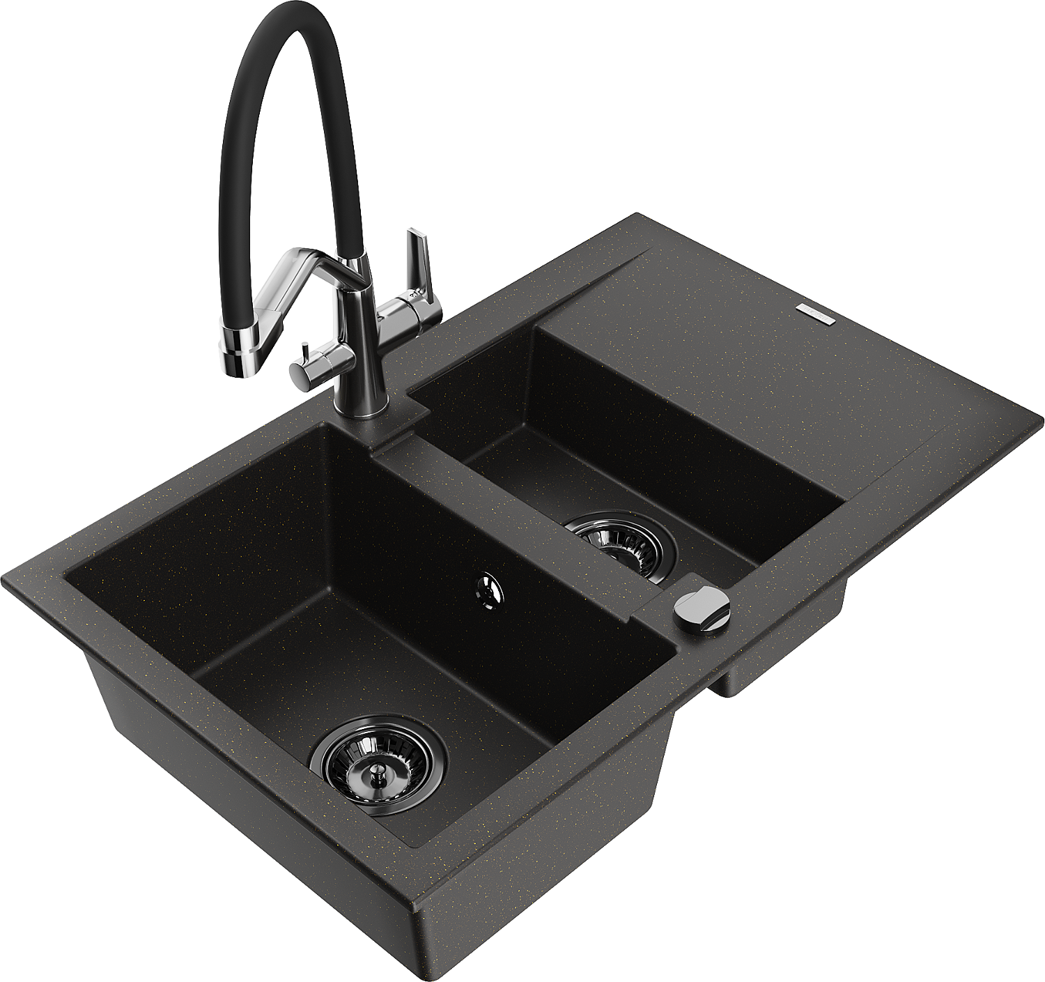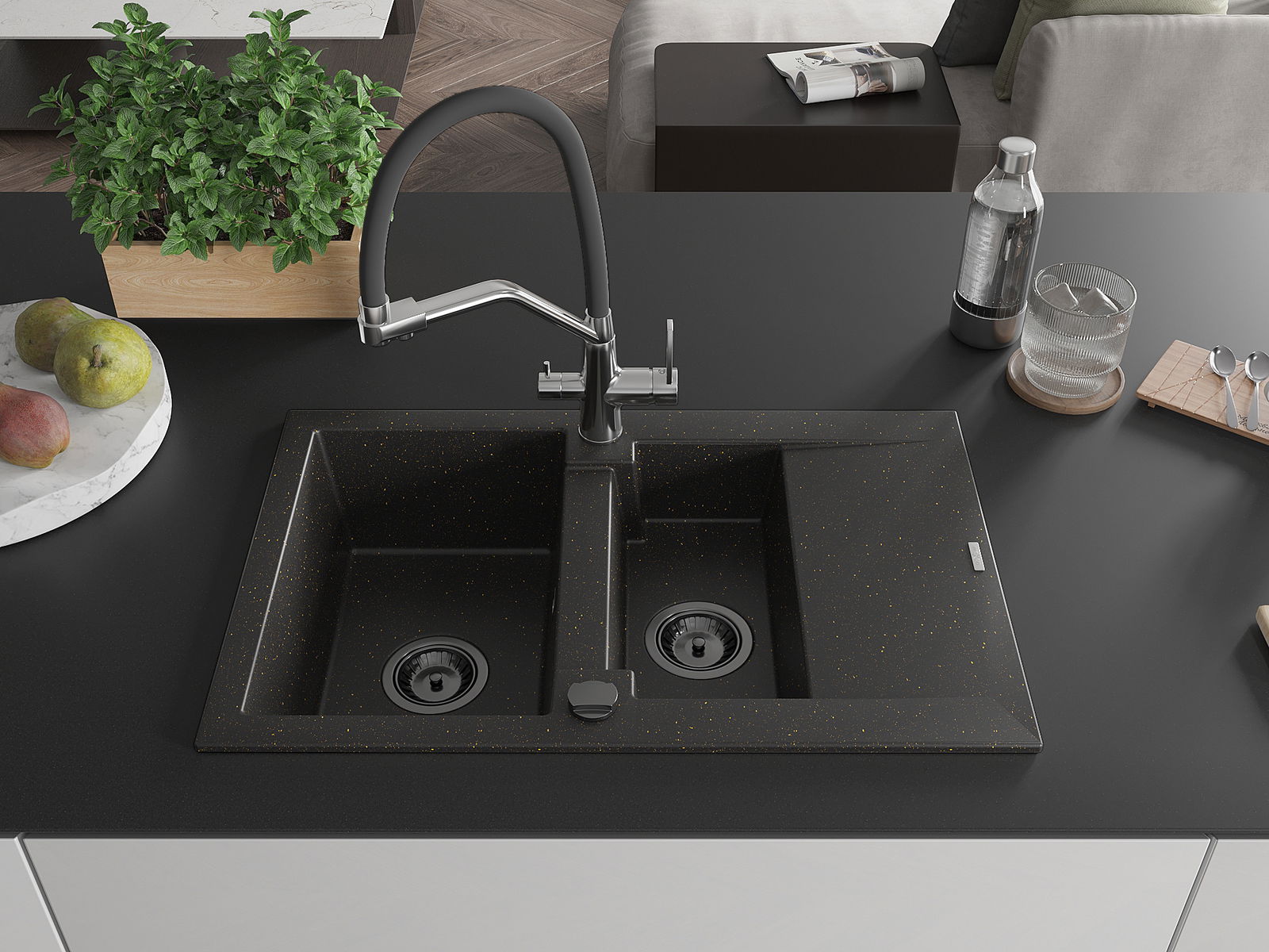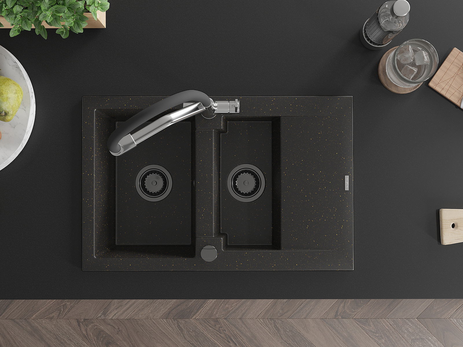 Mexen Gaspar lavello in granito 1,5 vasche con scolapiatti e miscelatore cucina Duo, nero/oro metallico - 6507-75-671701-07-B