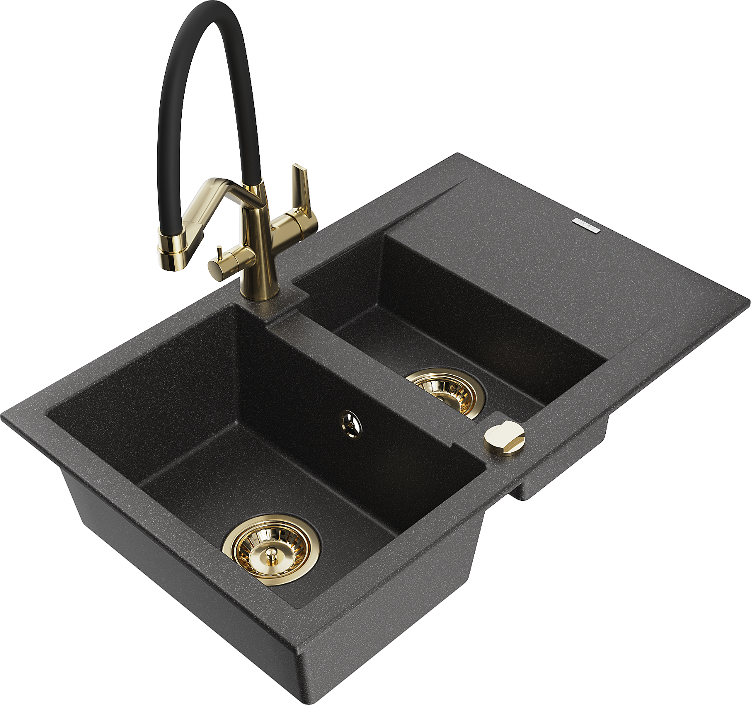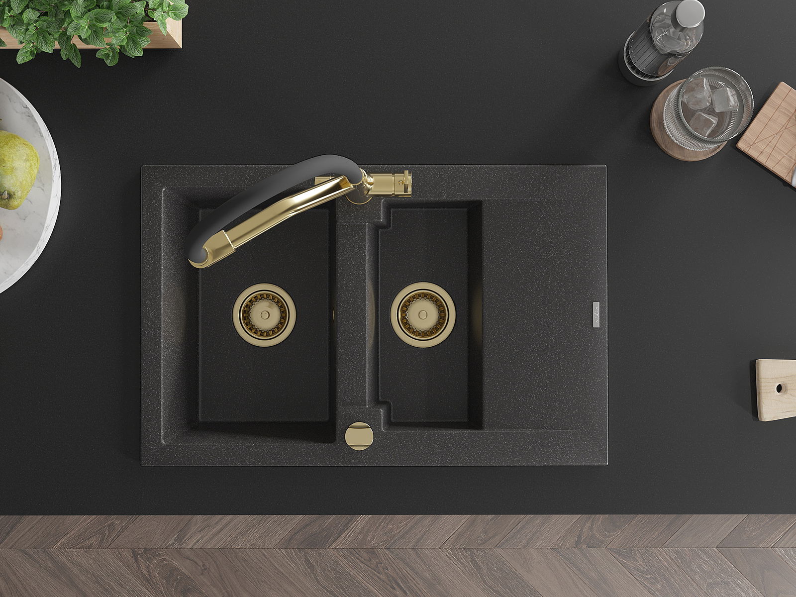 Mexen Gaspar lavello in granito 1,5 vasca con scolapiatti e rubinetto da cucina Duo, nero maculato - 6507-76-671701-57-G