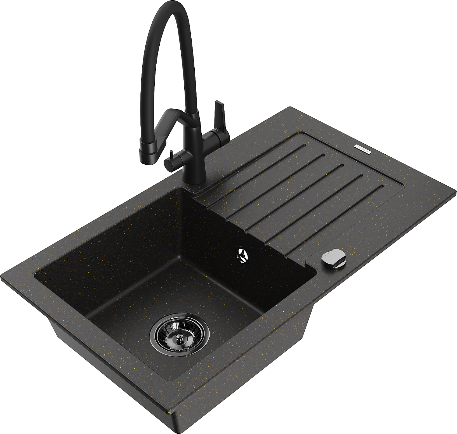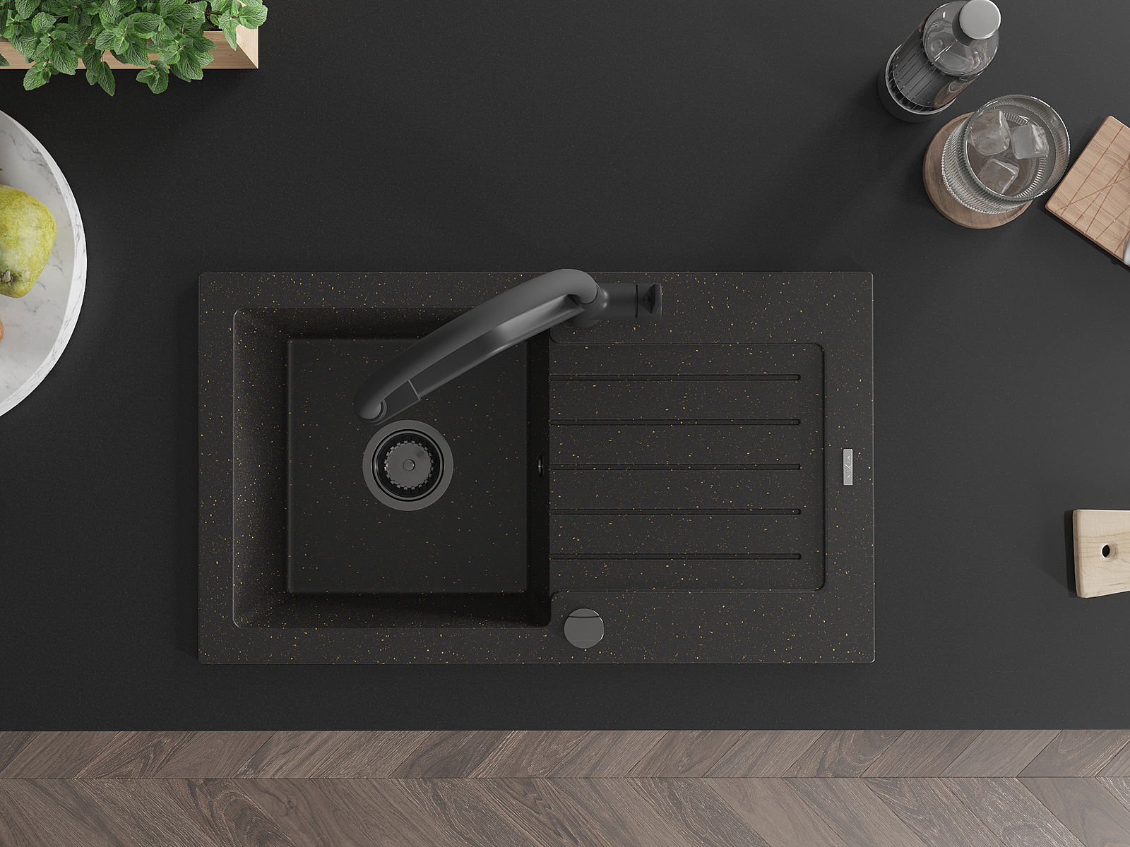 Mexen Pablo lavello in granito a 1 vasca con scolapiatti e rubinetto da cucina Duo, nero/oro metallico - 6510-75-671701-70-B