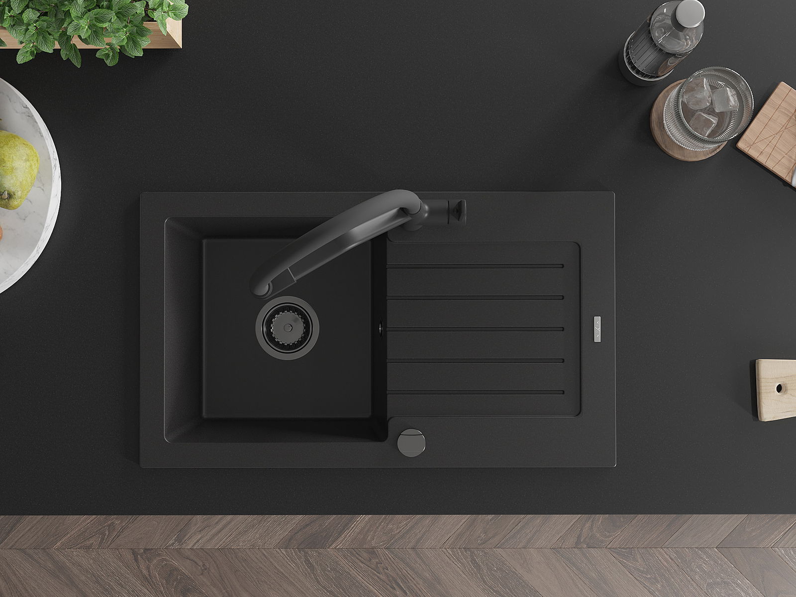 Mexen Pablo lavello in granito a 1 vasca con scolapiatti e rubinetto da cucina Duo, nero - 6510-77-671701-70-B