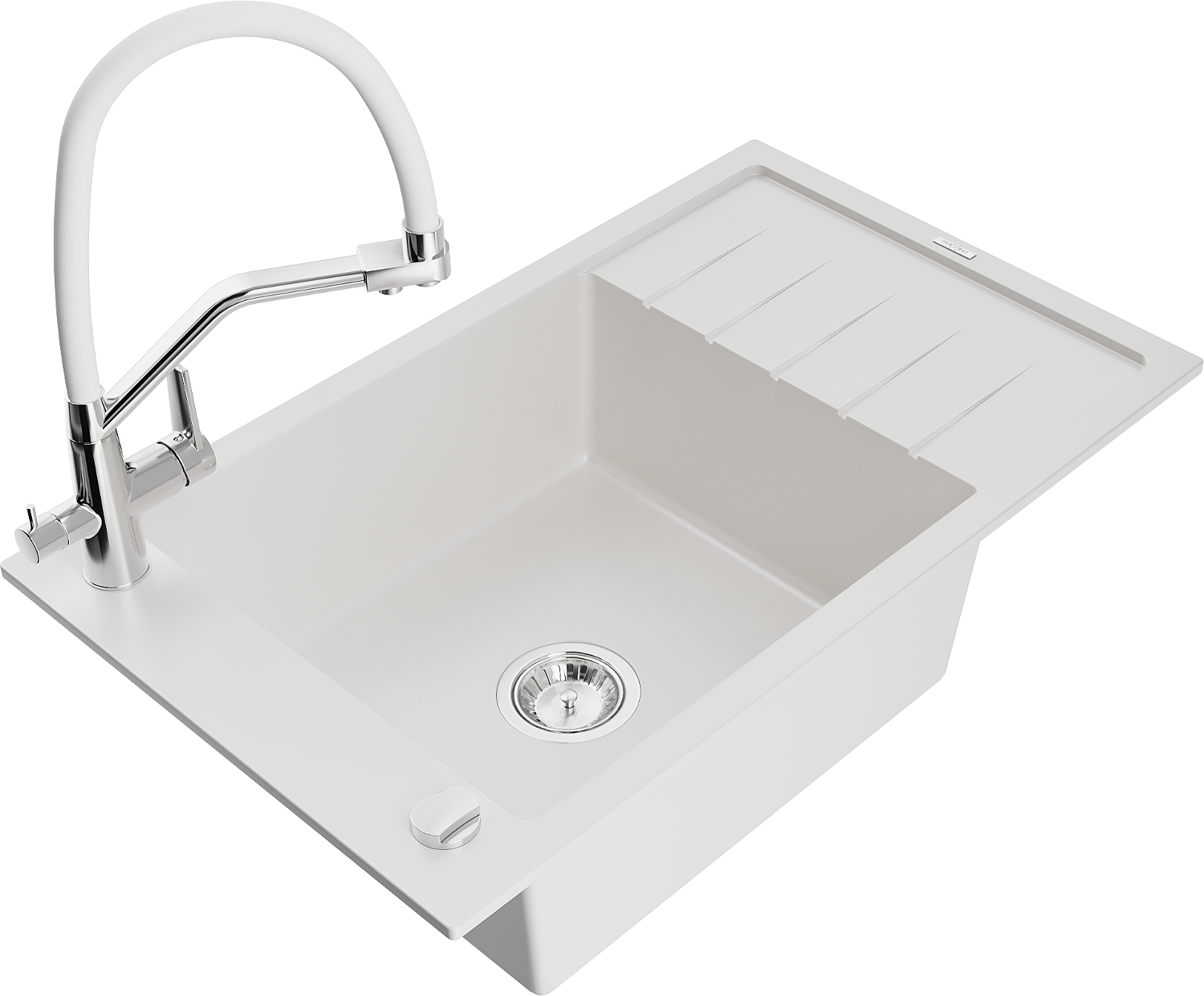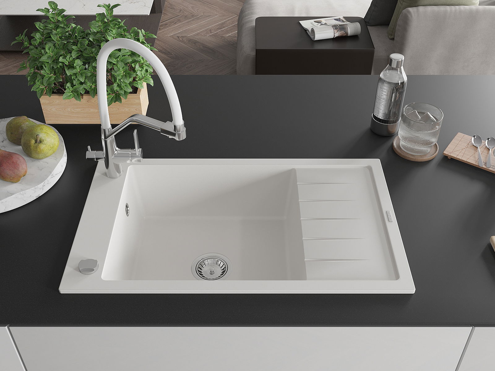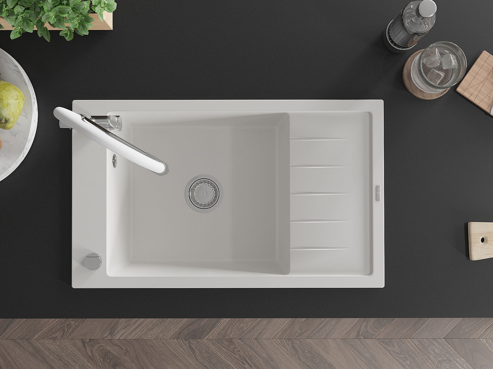 Mexen Elias lavello in granito a 1 vasca con sgocciolatoio e rubinetto da cucina Duo, bianco - 6511-20-671701-02