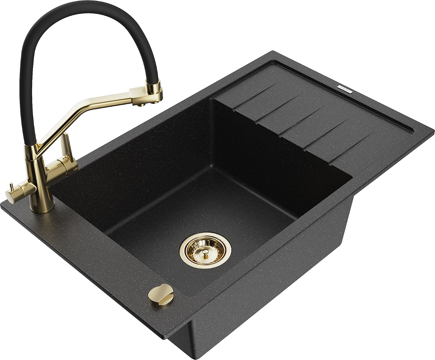 Mexen Elias lavello in granito a 1 vasca con scolapiatti e rubinetto da cucina Duo, nero/argento metallico - 6511-73-671701-57-G