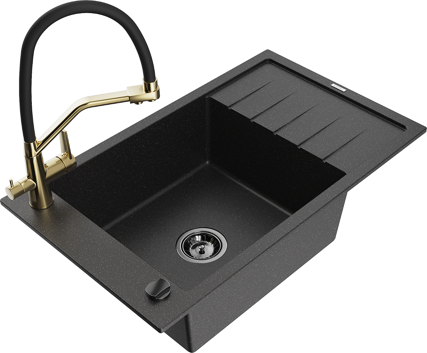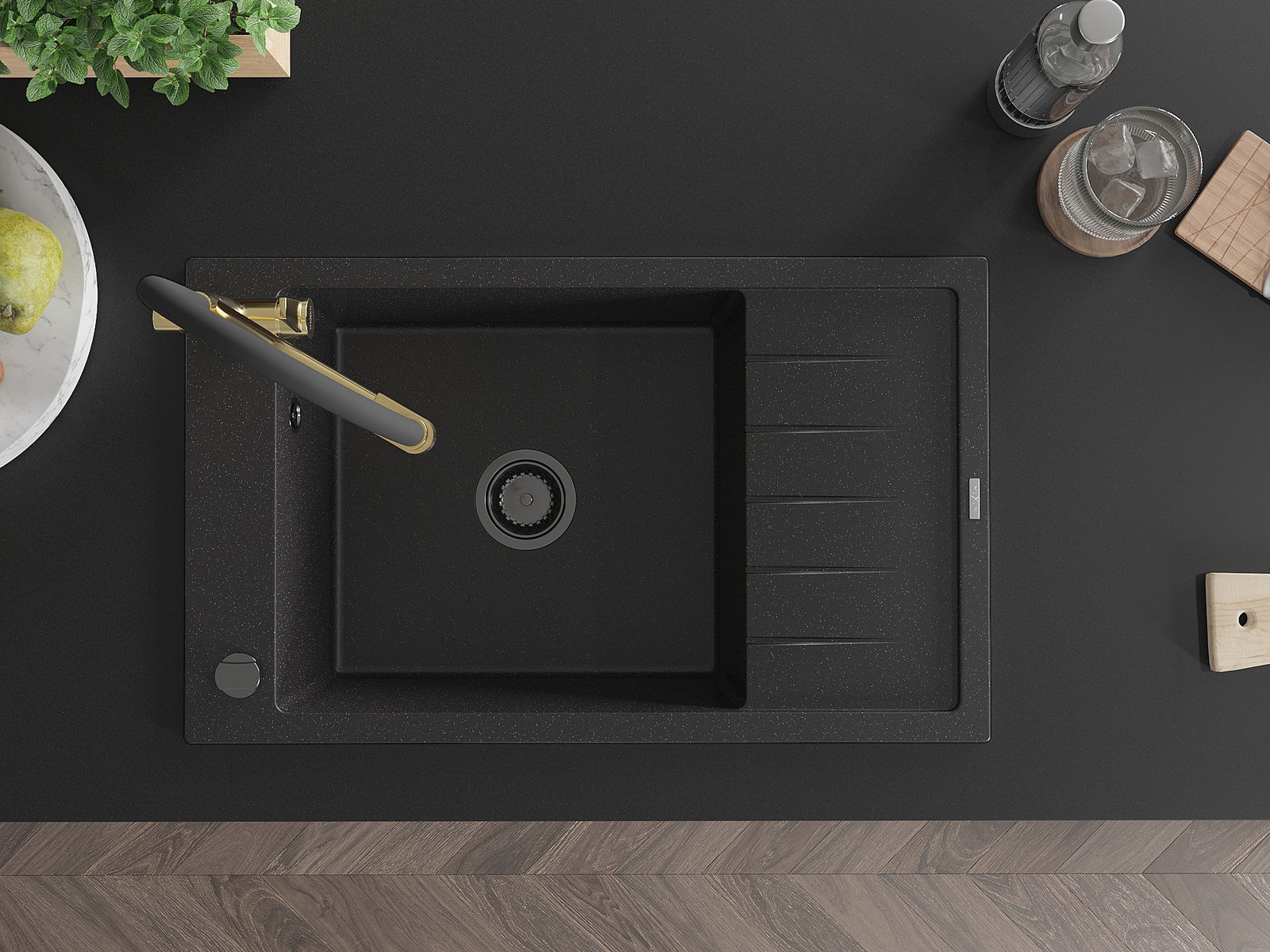 Mexen Elias lavello in granito a 1 vasca con sgocciolatoio e rubinetto da cucina Duo, nero/argento metallizzato