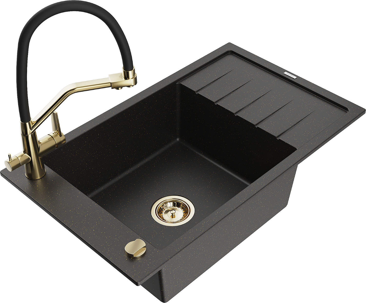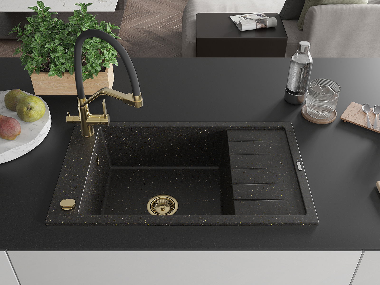 Mexen Elias lavello in granito ad una vasca con sgocciolatoio e miscelatore da cucina Duo, nero/oro metallizzato