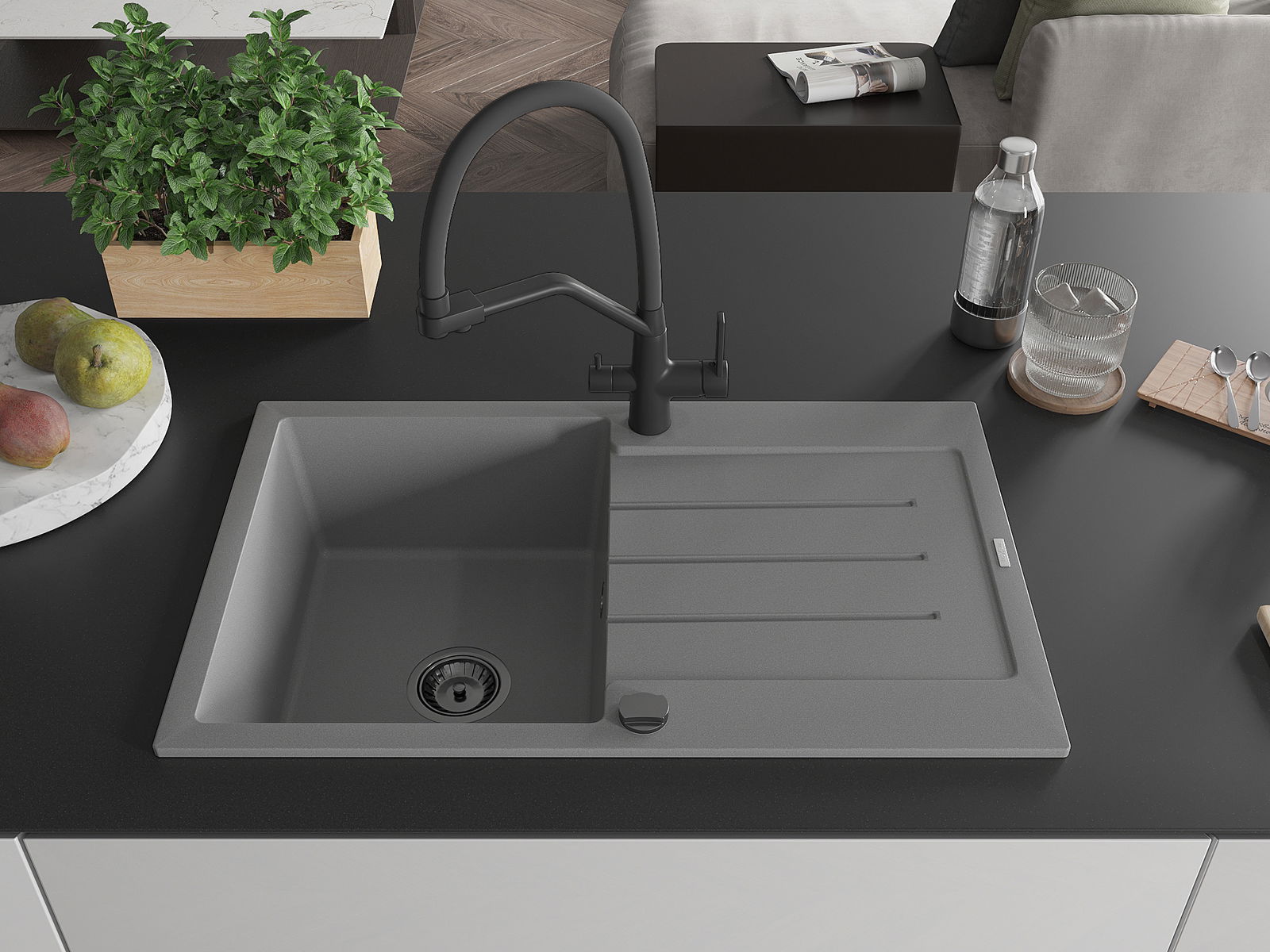 Mexen Bruno lavello da cucina in granito a 1 vasca con scolapiatti e rubinetto Duo, grigio - 6513-71-671701-70-B