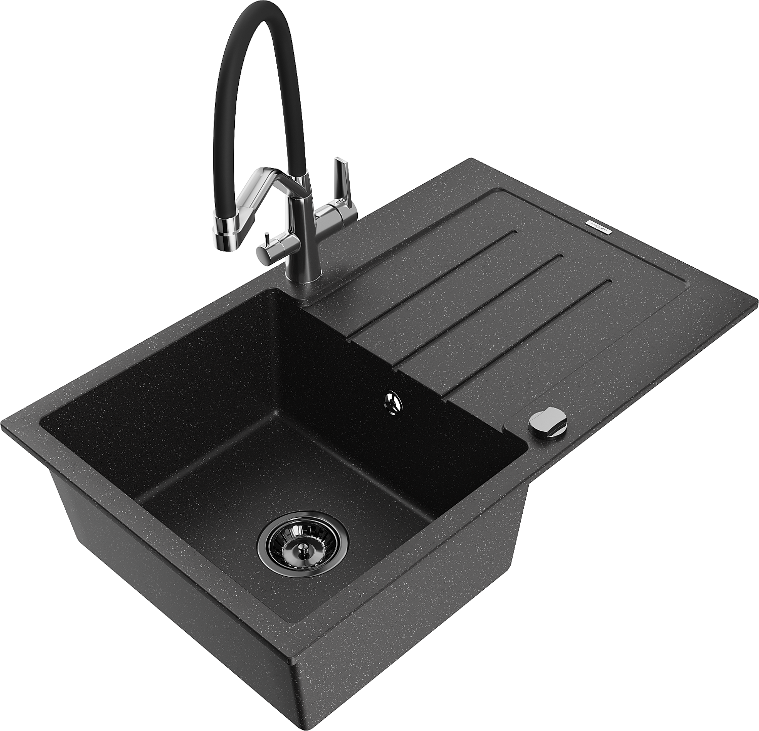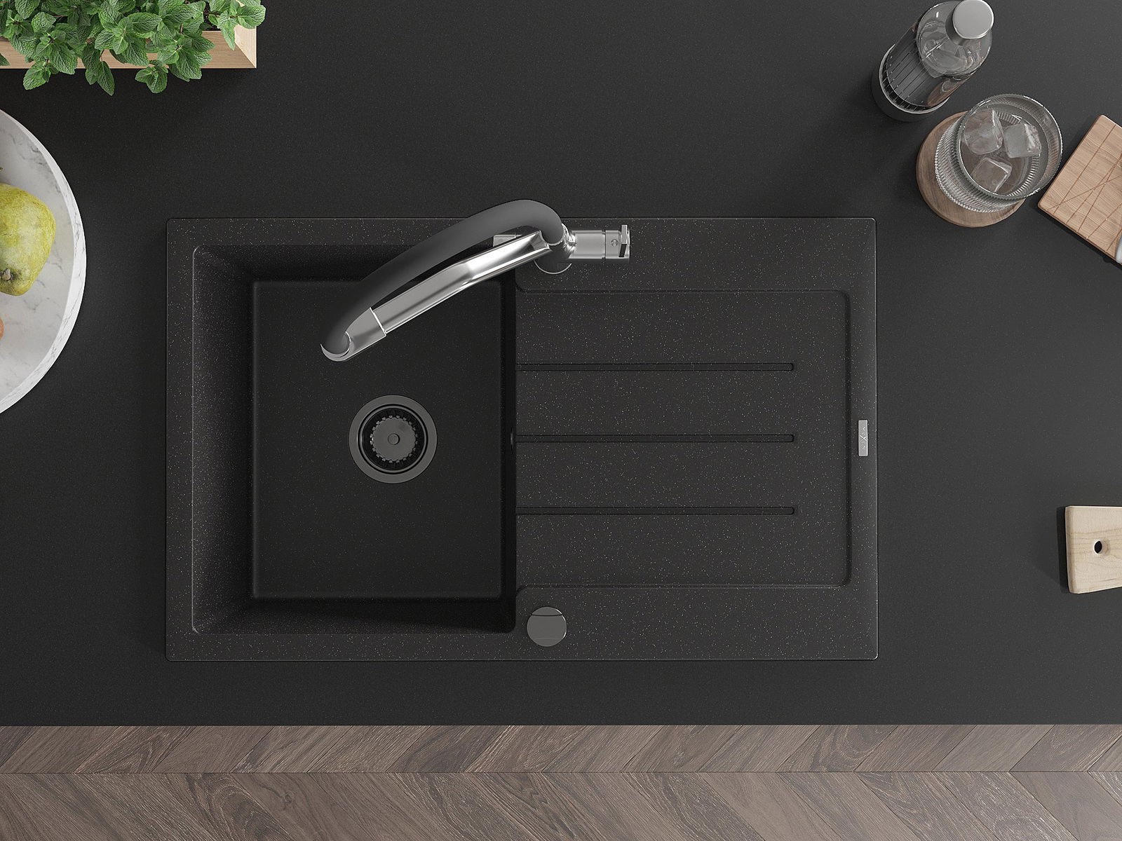 Mexen Bruno lavello in granito a una vasca con scolapiatti e rubinetto da cucina Duo, nero/argento metallico