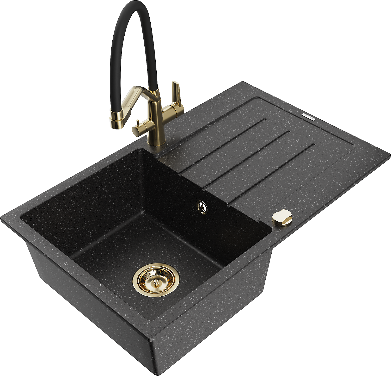 Mexen Bruno lavello in granito a 1 vasca con sgocciolatoio e rubinetto da cucina Duo, nero/argento metallizzato