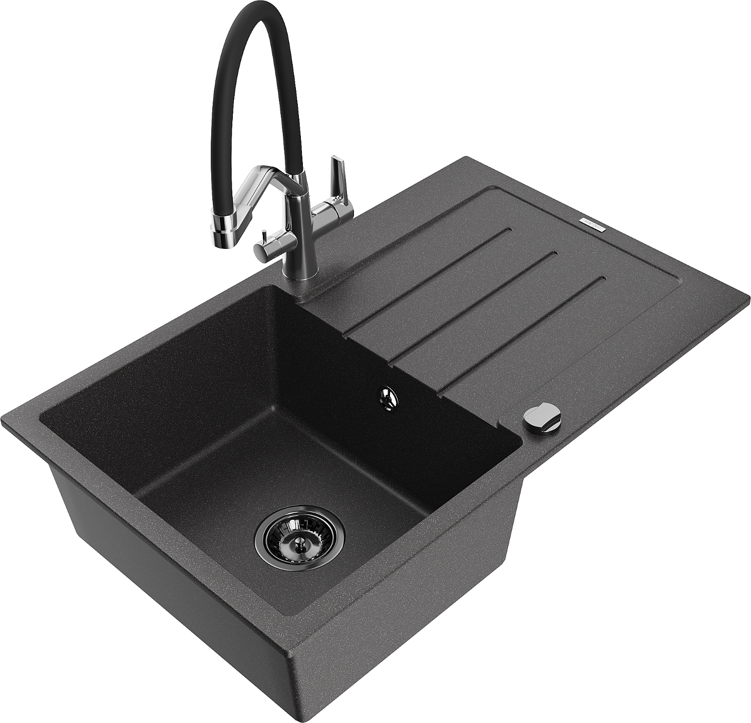 Mexen Bruno lavello da cucina in granito a 1 vasca con sgocciolatoio e rubinetto Duo, nero punteggiato - 6513-76-671701-07-B