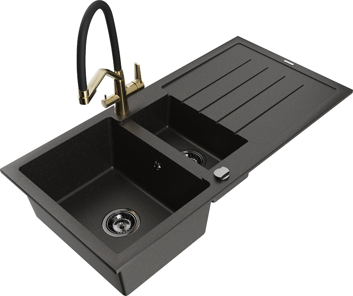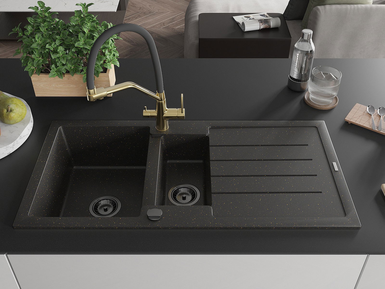 Mexen Andres lavello in granito 1,5 vasche con sgocciolatoio e rubinetto da cucina Duo, nero/oro metallizzato