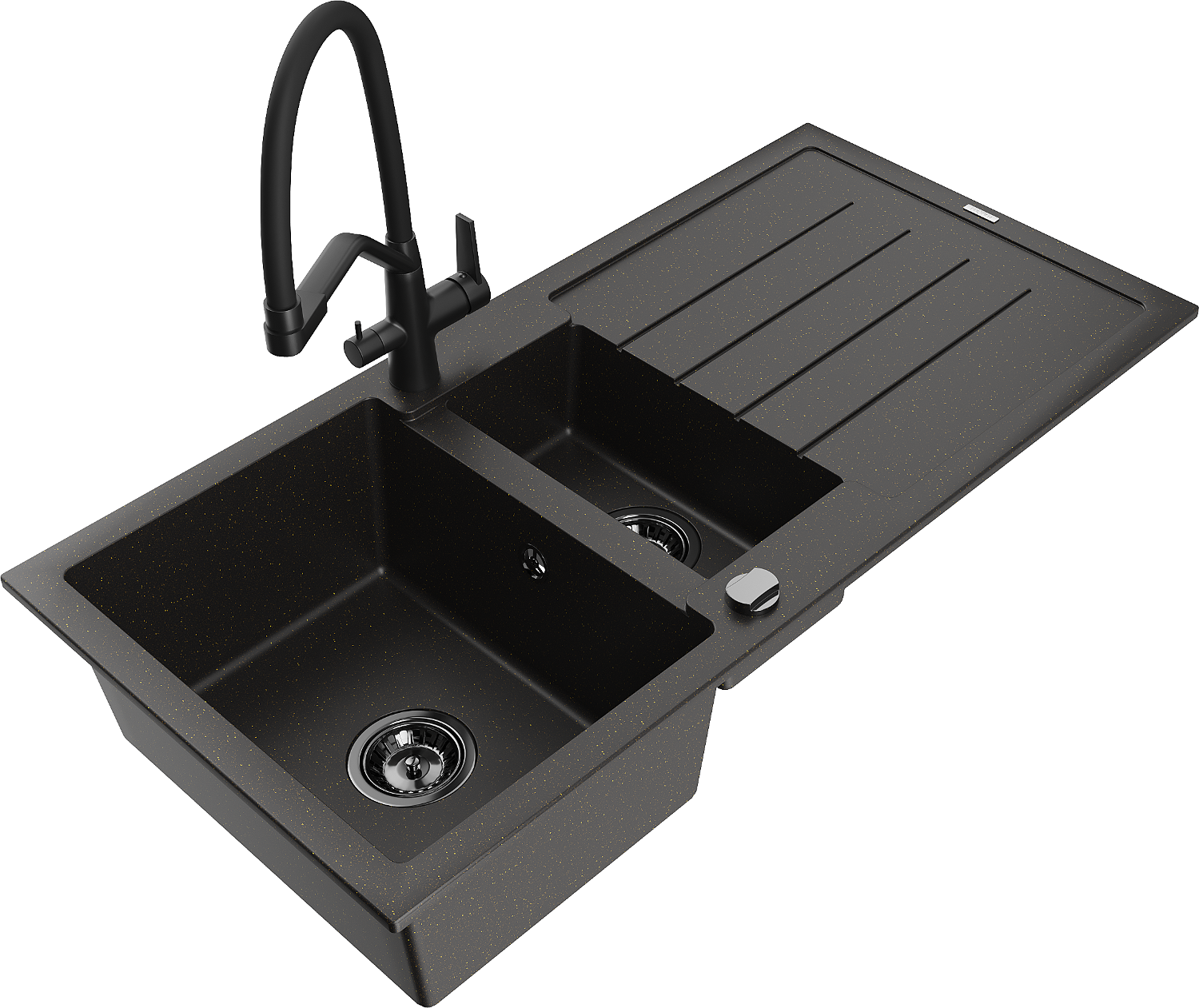 Mexen Andres lavello in granito 1,5 vasca con sgocciolatoio e batteria cucina Duo, nero/oro metallizzato - 6515-75-671701-70-B