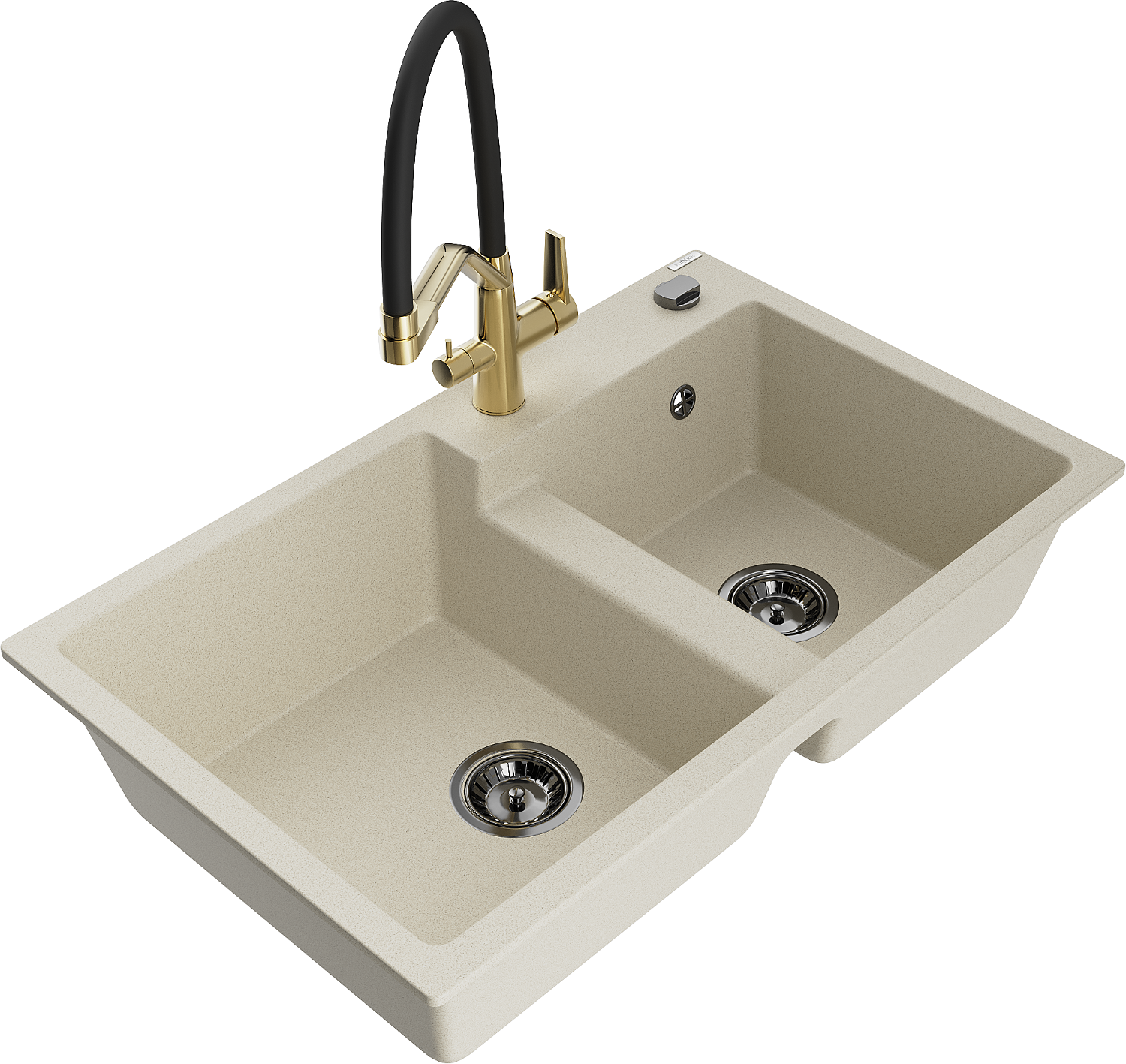 Mexen Tomas lavello da cucina in granito a 2 vasche con miscelatore Duo, beige - 6516-69-671701-57-B