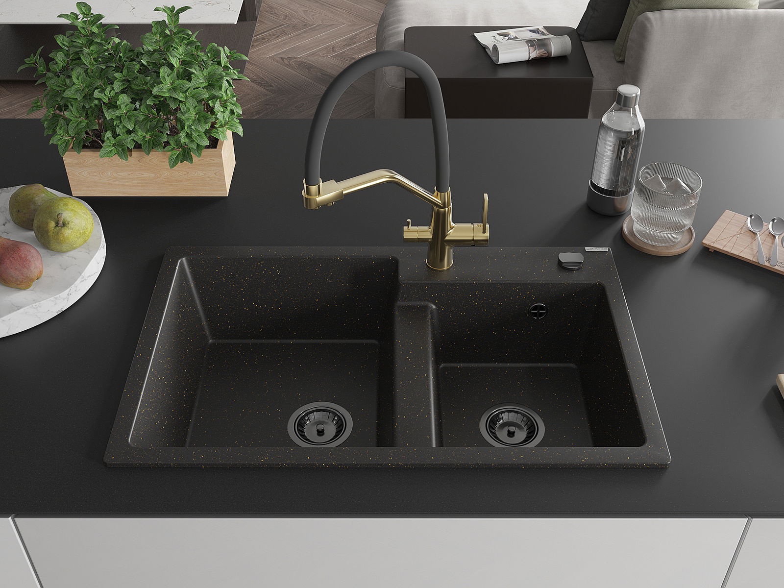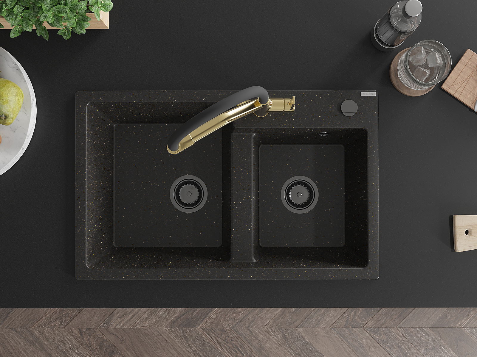 Mexen Tomas lavello in granito a 2 vasche con rubinetto da cucina Duo, nero/oro metallizzato - 6516-75-671701-57-B