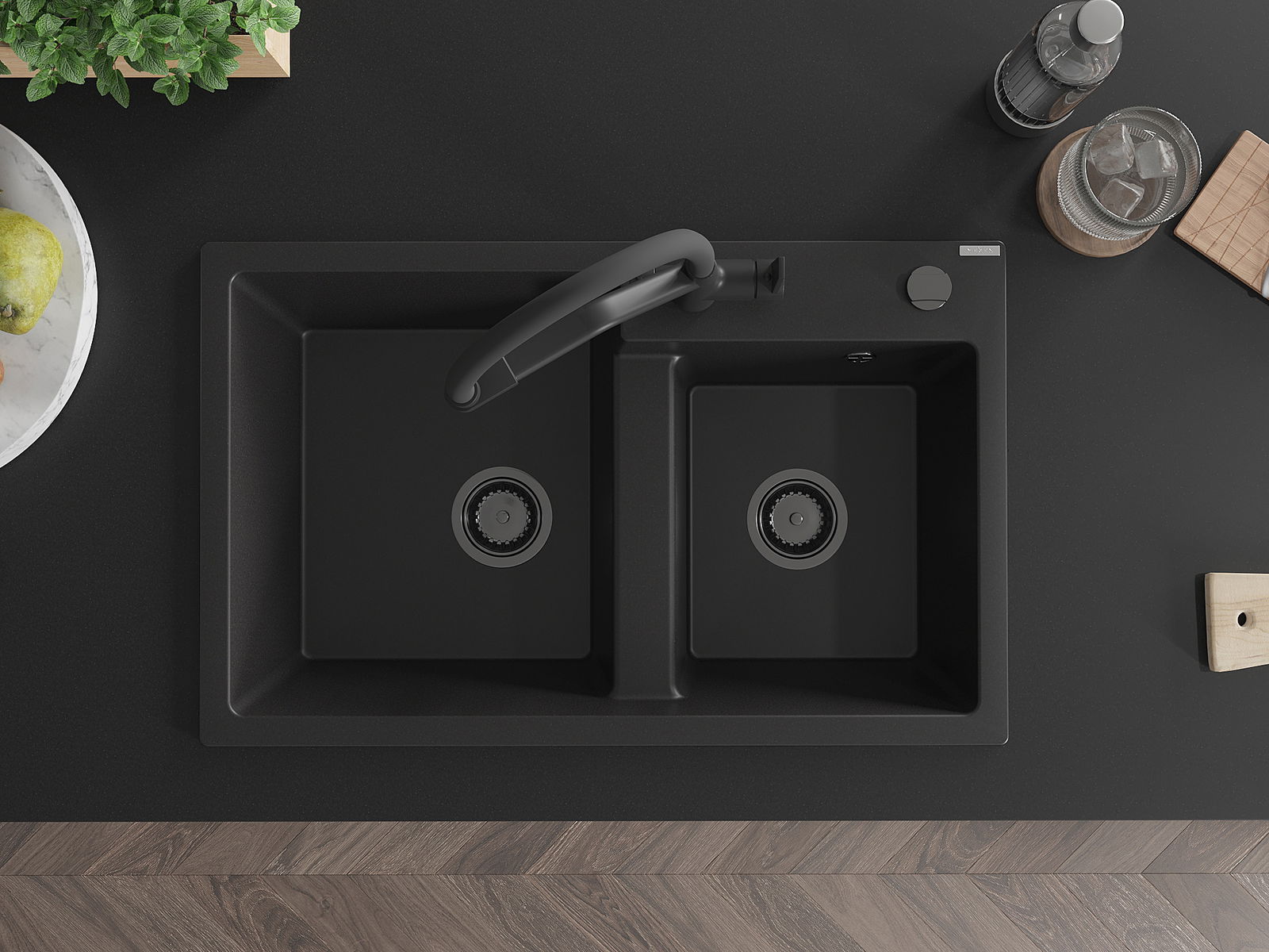 Mexen Tomas lavello da cucina in granito a 2 vasche con miscelatore Duo, nero - 6516-77-671701-70-B