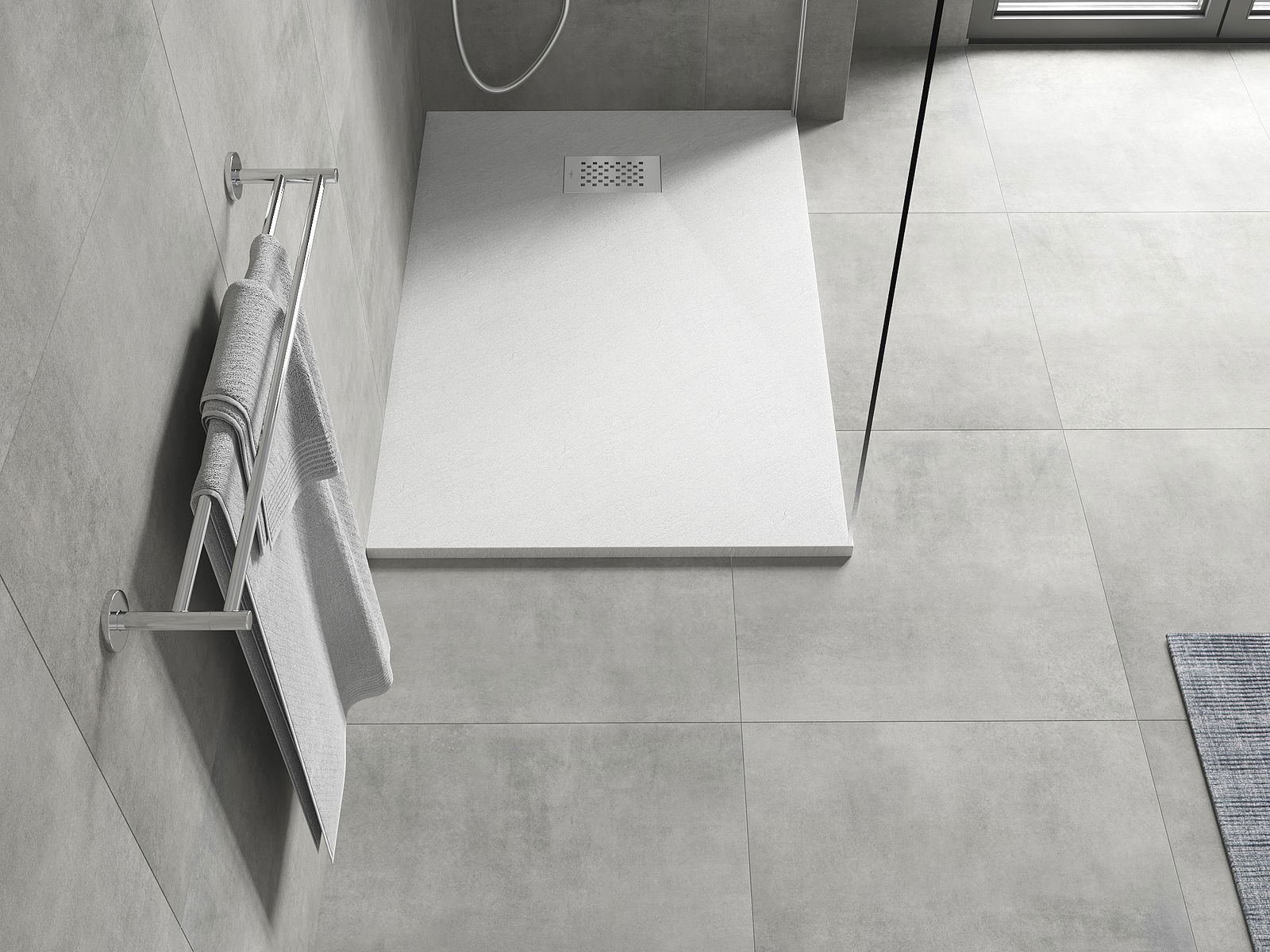 La superficie del piatto doccia con la sua struttura ricorda la pietra. Costituisce una combinazione eccezionale di aspetto naturale e design moderno degli interni. Aggiunge carattere, sottolinea l'estetica e l'eleganza dell'arredamento del bagno e affascina con la sua forma.