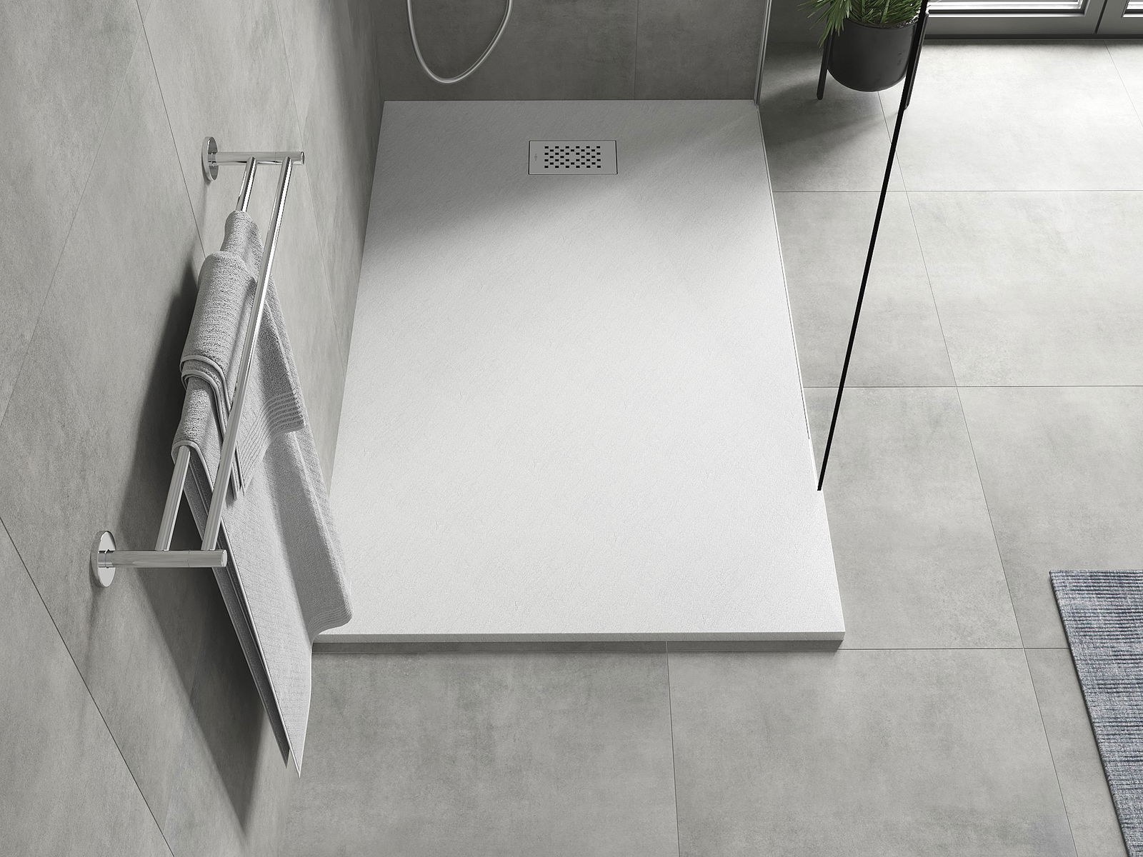 La superficie del piatto doccia con la sua struttura ricorda la pietra. Costituisce una combinazione eccezionale di aspetto naturale e design moderno degli interni. Aggiunge carattere, sottolinea l'estetica e l'eleganza dell'arredamento del bagno e affascina con la sua forma.