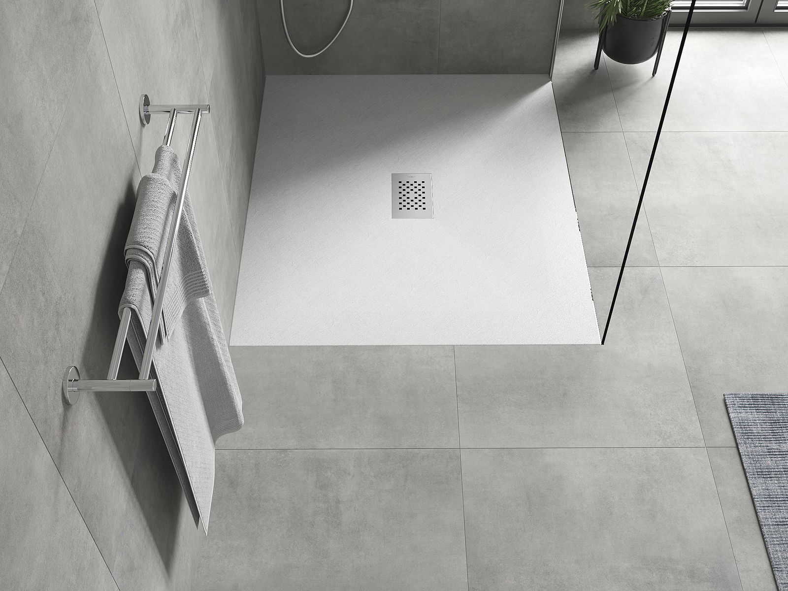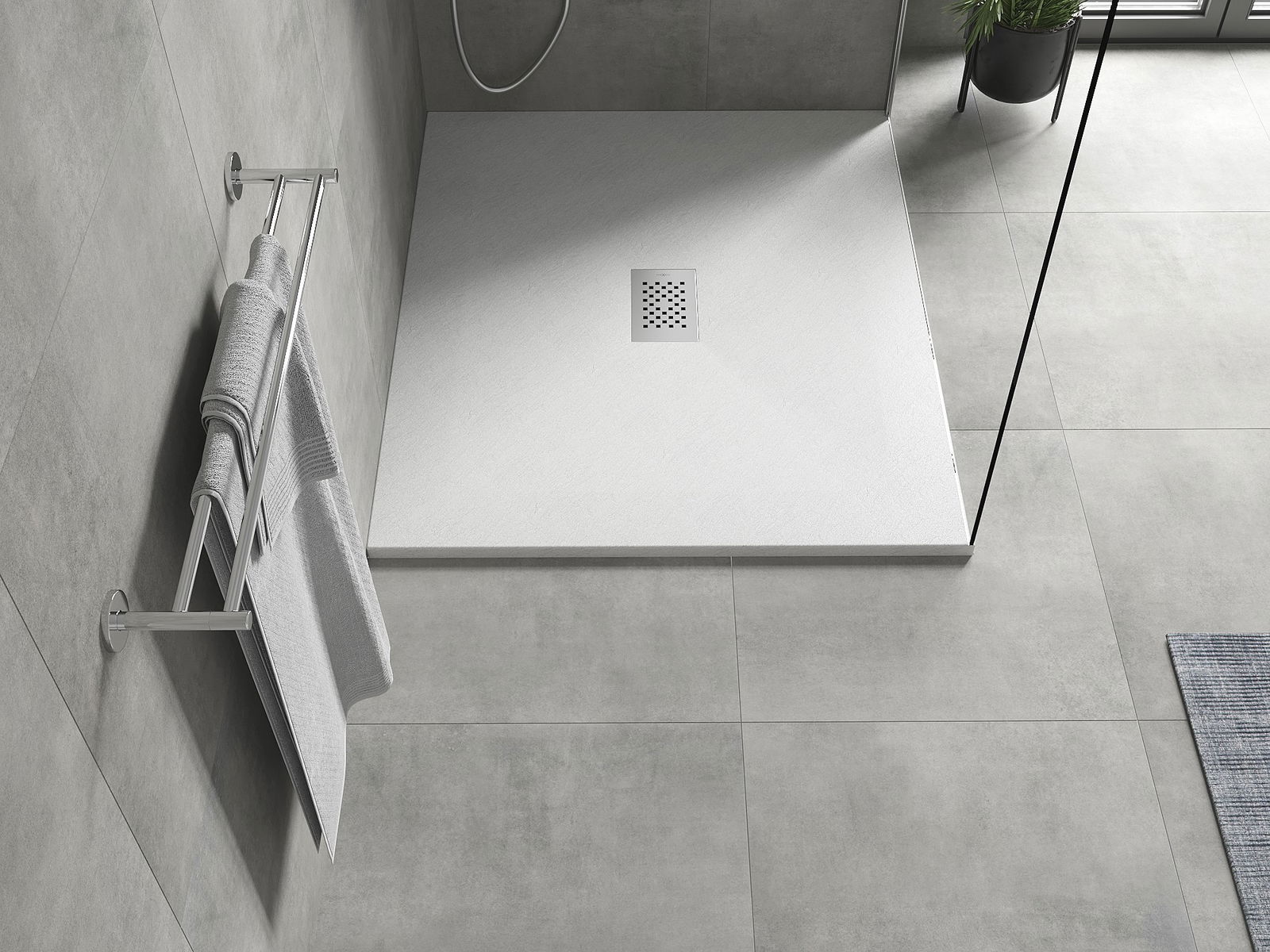La superficie del piatto doccia con la sua struttura ricorda la pietra. Costituisce una combinazione eccezionale di aspetto naturale e design moderno degli interni. Aggiunge carattere, sottolinea l'estetica e l'eleganza dell'arredamento del bagno e affascina con la sua forma.