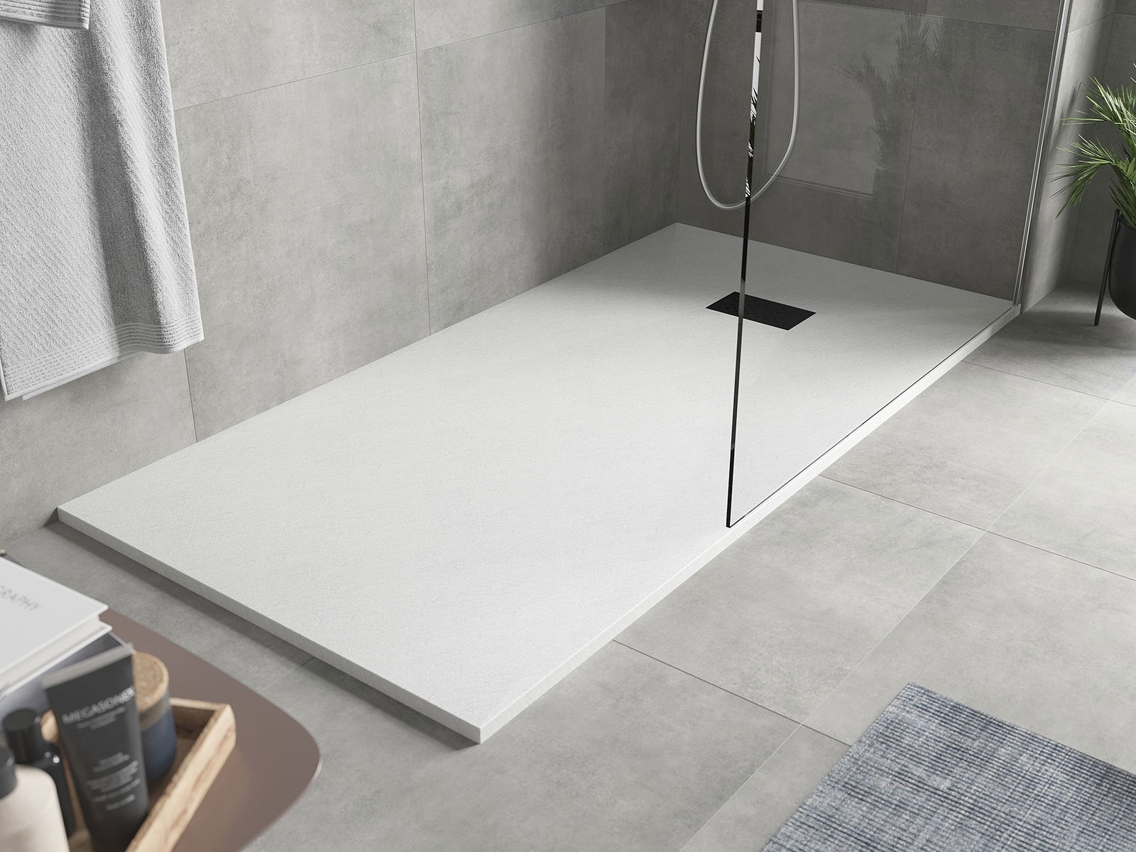 La superficie del piatto doccia con la sua struttura ricorda la pietra. Costituisce una combinazione eccezionale di aspetto naturale e design moderno degli interni. Aggiunge carattere, sottolinea l'estetica e l'eleganza dell'arredamento del bagno e affascina con la sua forma.