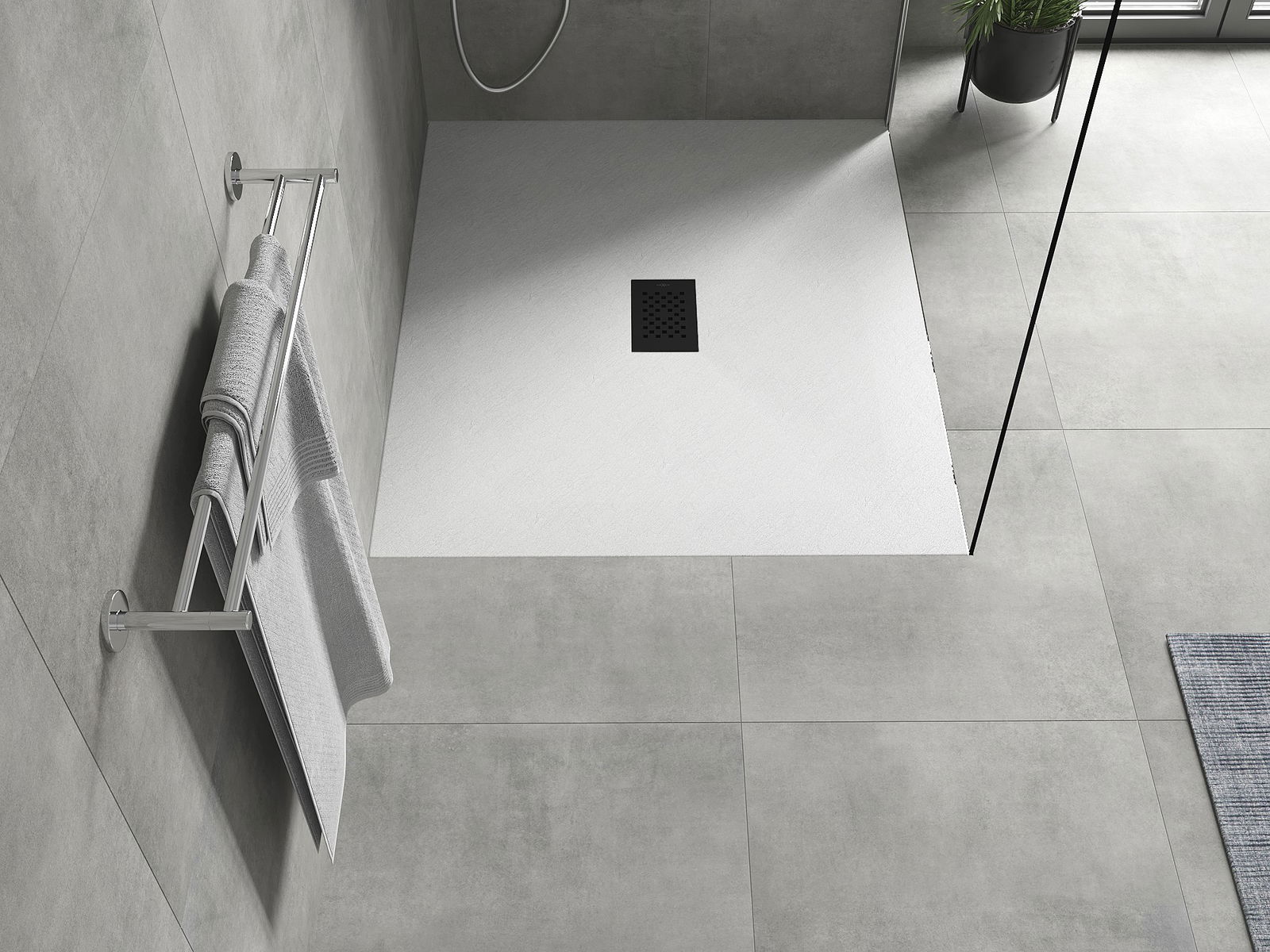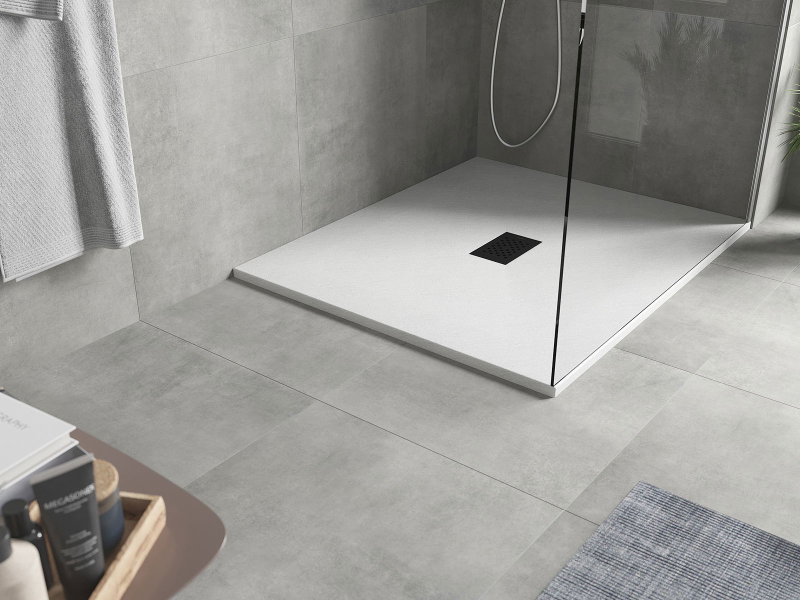 La superficie del piatto doccia con la sua struttura ricorda la pietra. Costituisce una combinazione eccezionale di aspetto naturale e design moderno degli interni. Aggiunge carattere, sottolinea l'estetica e l'eleganza dell'arredamento del bagno e affascina con la sua forma.