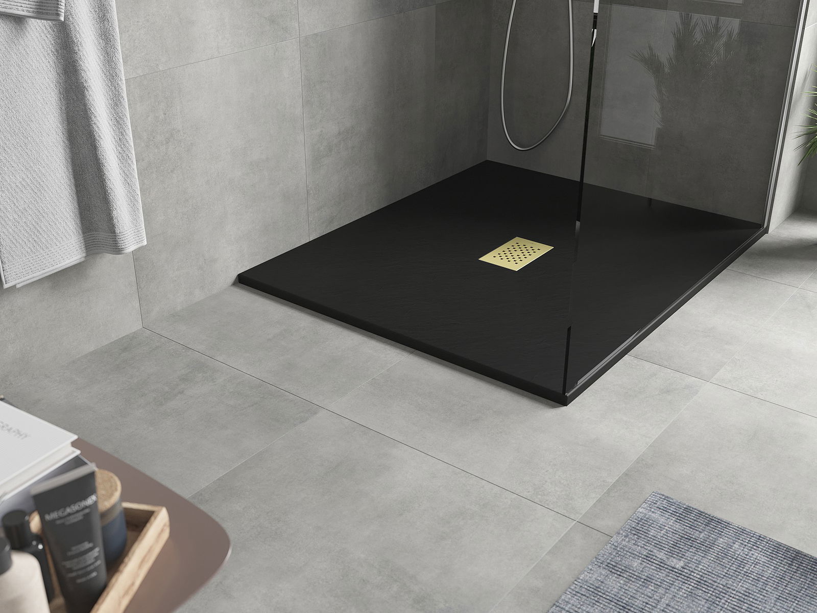 La superficie del piatto doccia con la sua struttura ricorda la pietra. Costituisce una combinazione eccezionale di aspetto naturale e design moderno degli interni. Aggiunge carattere, sottolinea l'estetica e l'eleganza dell'arredamento del bagno e affascina con la sua forma.