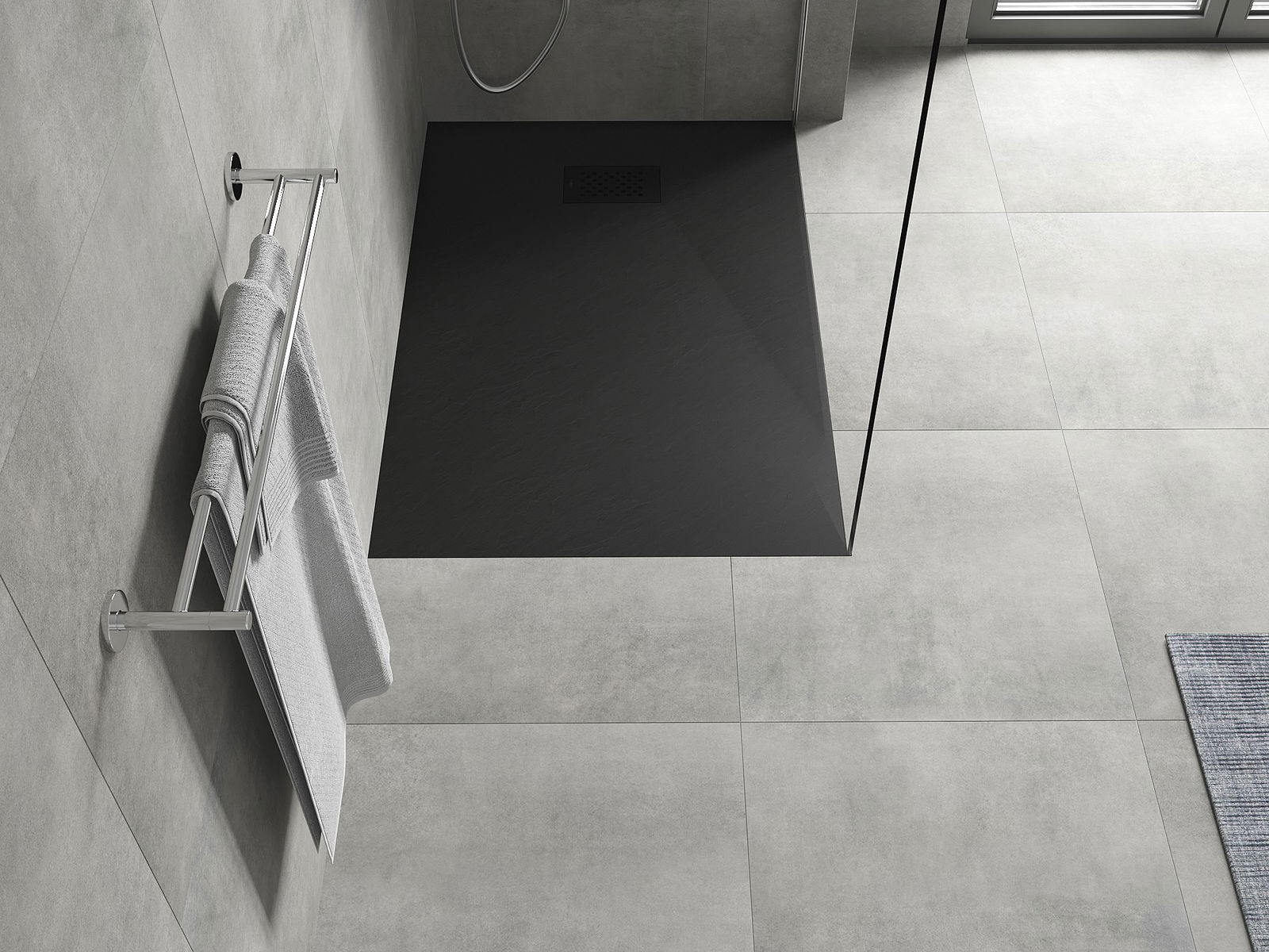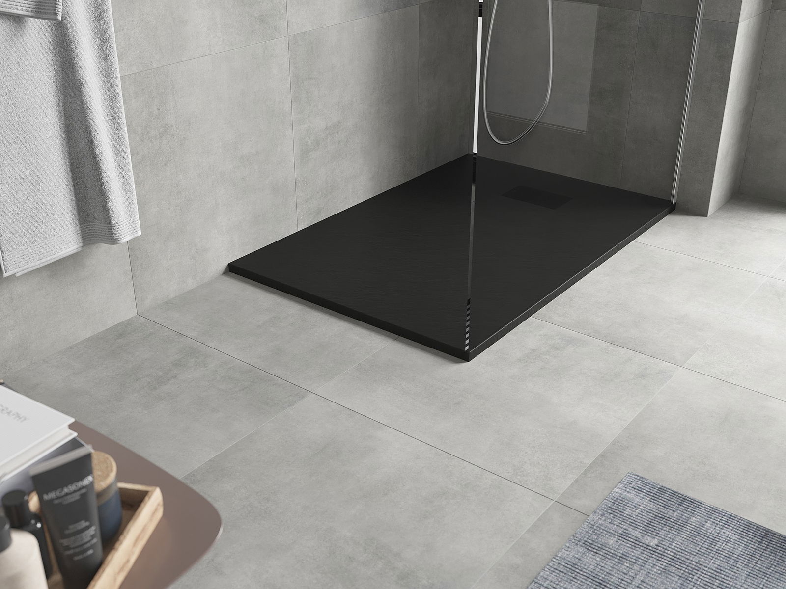 La superficie del piatto doccia con la sua struttura ricorda la pietra. Costituisce una combinazione eccezionale di aspetto naturale e design moderno degli interni. Aggiunge carattere, sottolinea l'estetica e l'eleganza dell'arredamento del bagno e affascina con la sua forma.