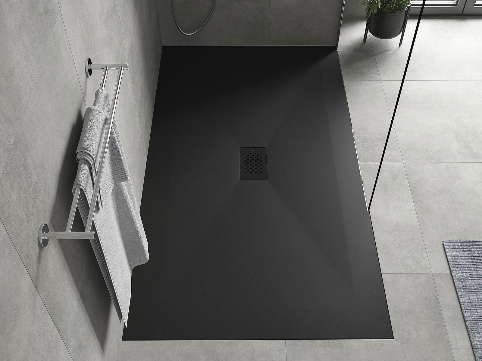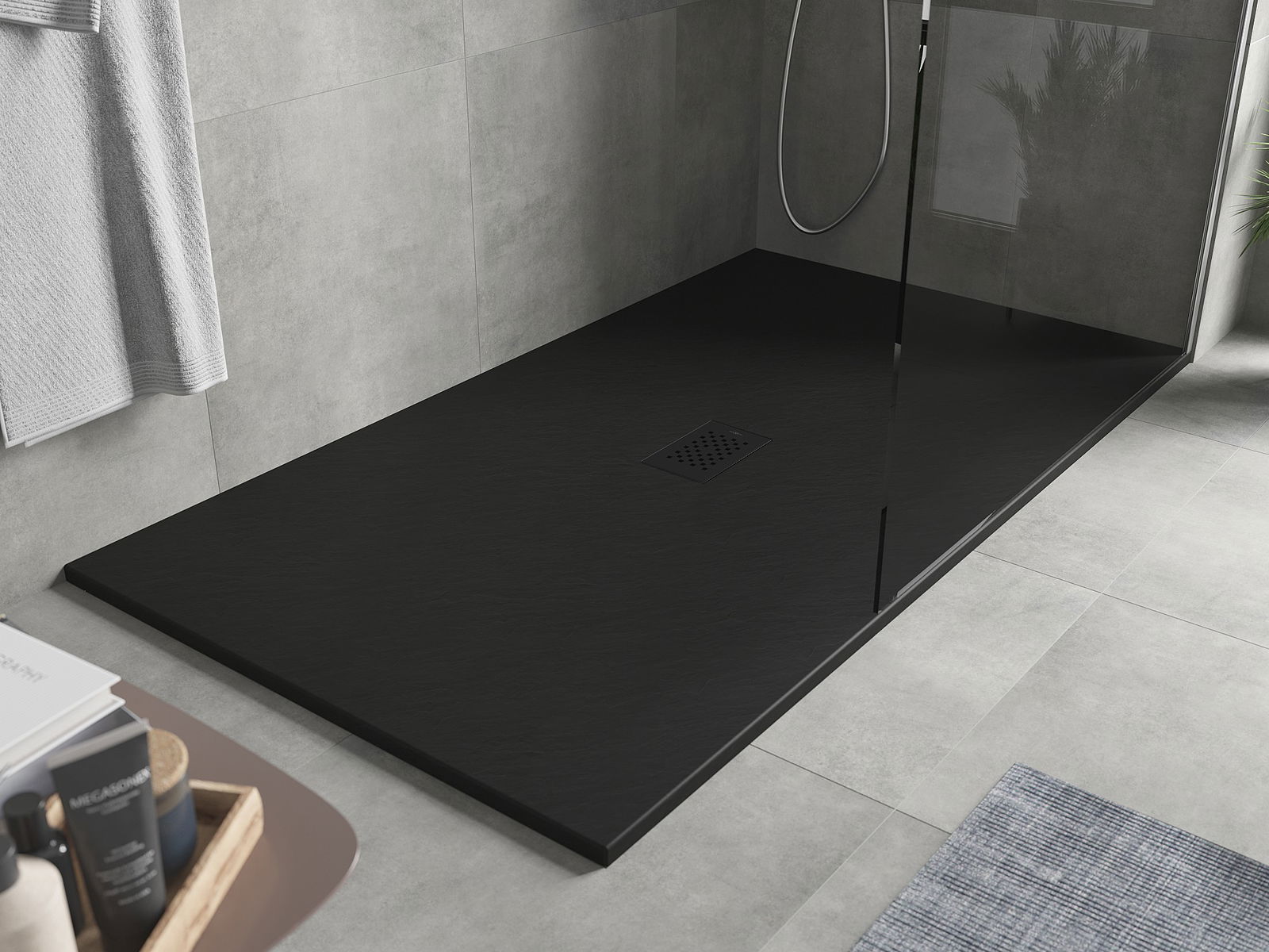 La superficie del piatto doccia con la sua struttura ricorda la pietra. Costituisce una combinazione eccezionale di aspetto naturale e design moderno degli interni. Aggiunge carattere, sottolinea l'estetica e l'eleganza dell'arredamento del bagno e affascina con la sua forma.