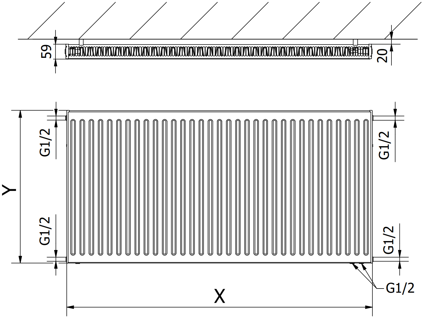 Le immagini mostrano il radiatore nelle dimensioni 600 x 1200 mm.