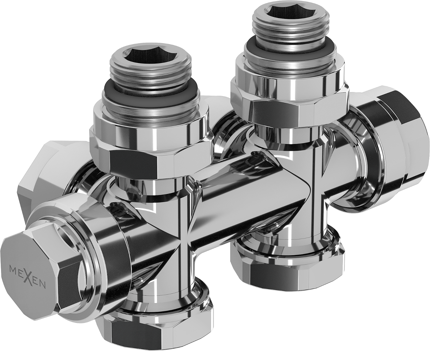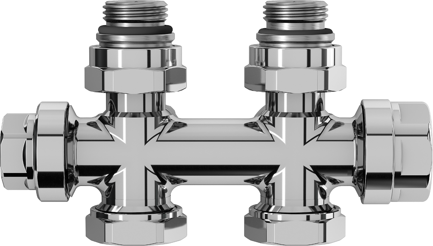 Valvola universale di alimentazione e arresto per collegamenti ad angolo e dritti, indipendentemente dal fatto che il collegamento sia a parete o a pavimento