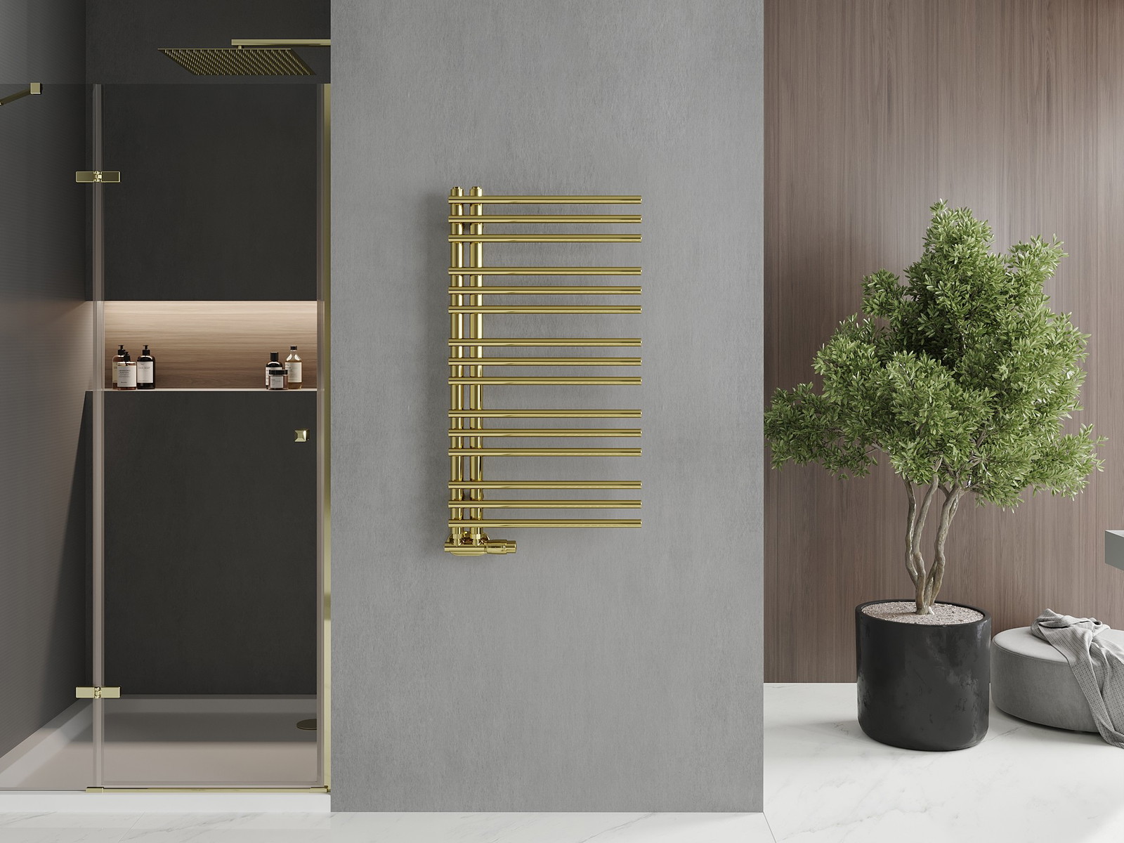 Mexen Neptun è un radiatore da bagno decorativo con dimensioni di 900 x 500 mm, che combina perfettamente estetica e funzionalità. Il suo rivestimento dorato aggiunge eleganza a qualsiasi ambiente, mentre la struttura in acciaio garantisce durata e resistenza alla corrosione. Con una potenza termica di 291 W e la capacità di lavorare a temperature fino a 95 °C, Neptun riscalda efficacemente l'ambiente. Si distingue per la classe di reazione al fuoco A1 e la pressione massima di esercizio di 0,6 Mpa. Il prodotto è dotato di collegamenti 4xG ½″ che consentono una facile installazione della resistenza e del kit di montaggio.