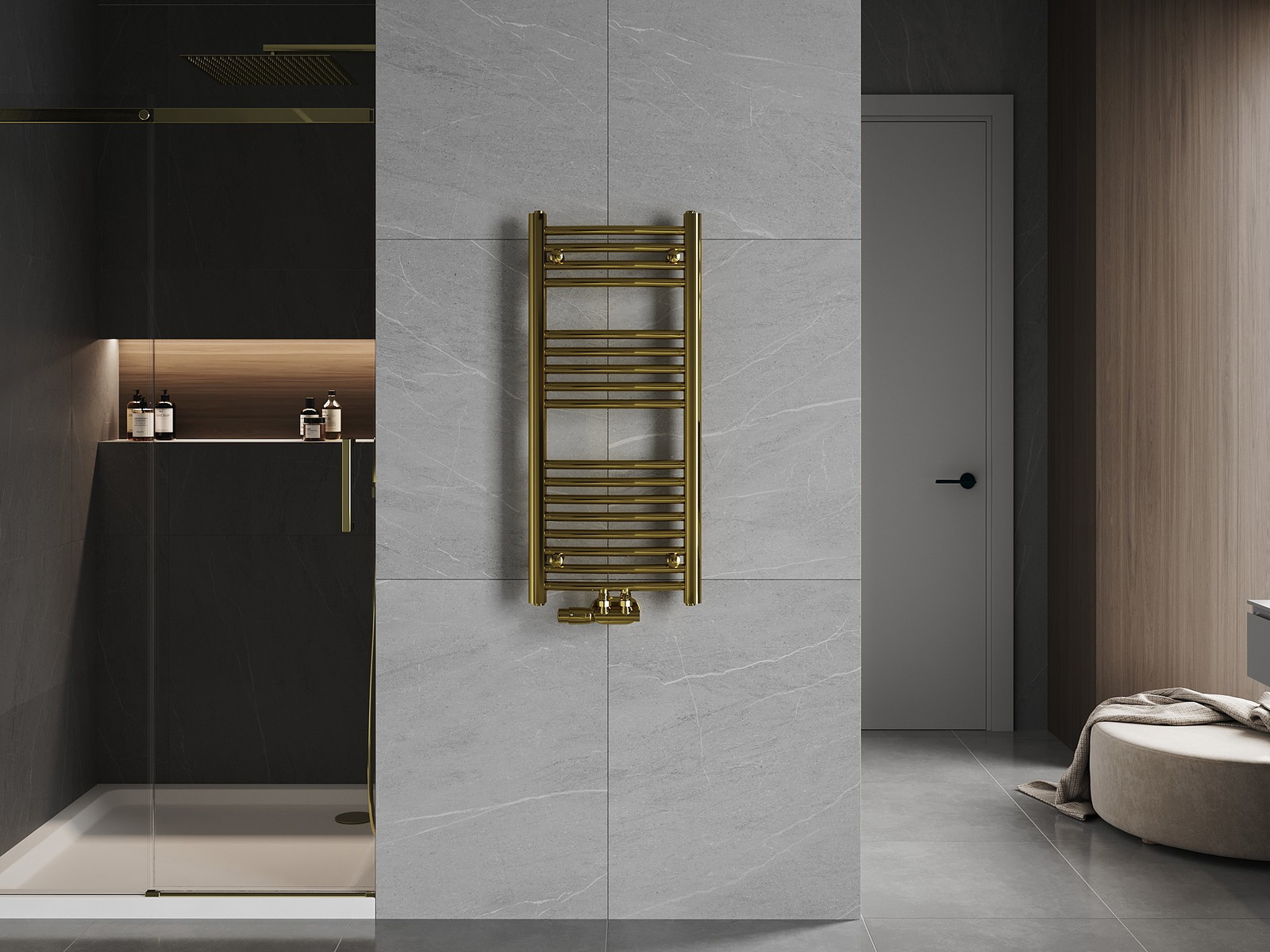 Mexen Ares è un radiatore da bagno con un elegante finitura dorata, che unisce perfettamente stile ed efficienza. Misura 900 x 400 mm, il che lo rende una scelta ideale per varie configurazioni di bagno. Grazie alla sua struttura in acciaio pesa solo 5,24 kg, e la potenza termica è di 246 W alla temperatura di 75/65/20 °C. Ha opzioni di collegamento flessibili e la possibilità di montare una resistenza, offrendo versatili possibilità di installazione. La resistenza alla corrosione e la reazione al fuoco A1 garantiscono durata e sicurezza d'uso. In dotazione vi è un kit di montaggio e accessori.