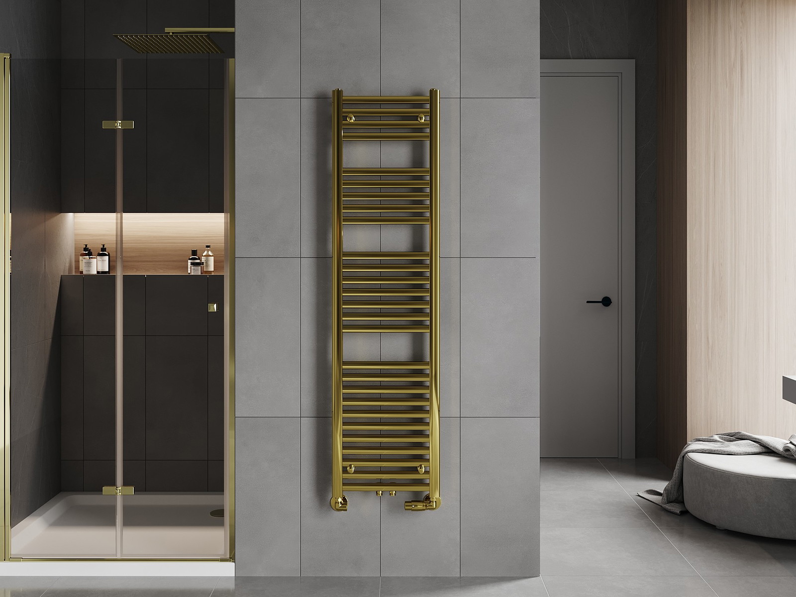 Mexen Hades è un elegante radiatore da bagno di colore dorato che combina perfettamente funzionalità e stile. Le sue dimensioni sono 1500x400 mm e offre una potenza termica impressionante di 461 W alle temperature di 75/65/20°C. Il radiatore è realizzato in acciaio di alta qualità, garantendo durata e resistenza alla corrosione grazie a uno speciale rivestimento. Il prodotto consente il montaggio di una resistenza e offre flessibilità di collegamento: inferiore o centrale. Ideale per bagni moderni, garantisce comfort termico a una temperatura di lavoro massima di 95°C e pressione di 0,6 Mpa.