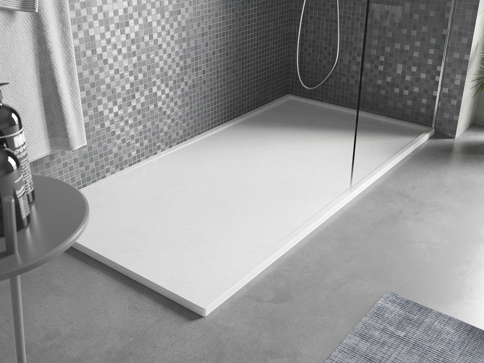 La superficie del piatto doccia con la sua struttura ricorda la pietra. Costituisce una combinazione eccezionale di aspetto naturale e design moderno degli interni. Aggiunge carattere, sottolinea l'estetica e l'eleganza dell'arredamento del bagno e affascina con la sua forma.